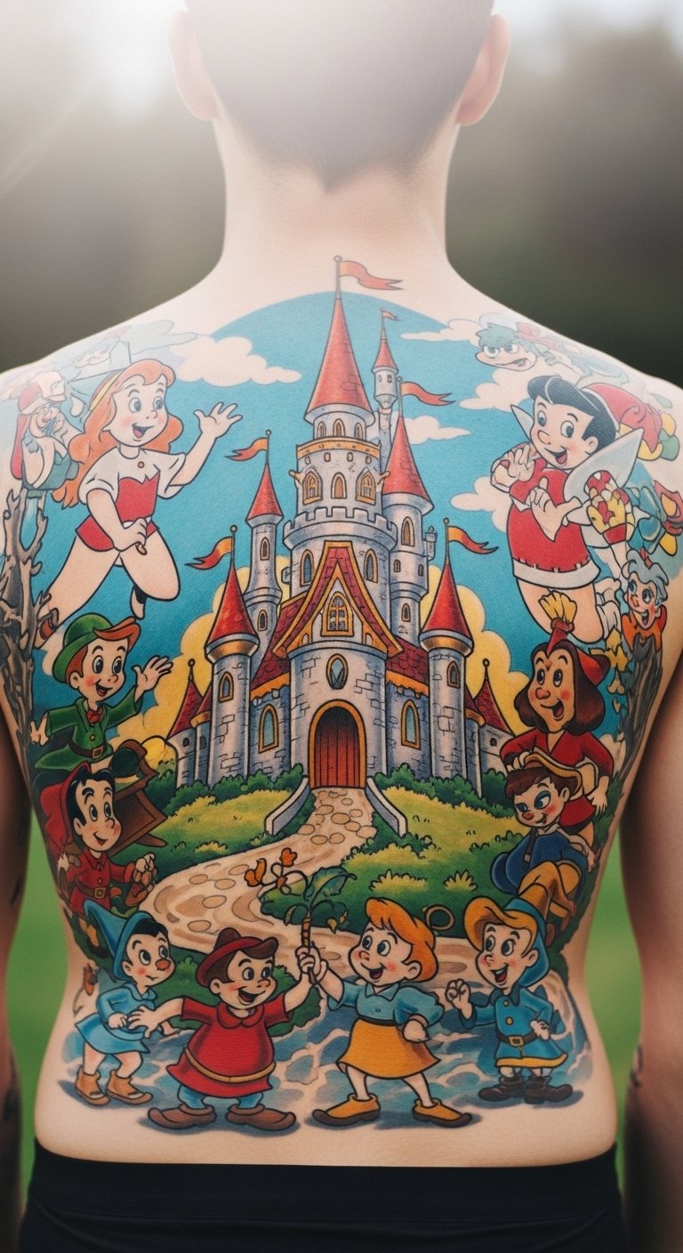 A castle scene on your back. This design tells tales. Sketch scenes. Find affordable ink. Use story stickers. Share tales. Put on back. Add princes. Keep safe. Draw stories. Join tale groups. Scene your life. Cut expenses. Try with stories. Dream on.