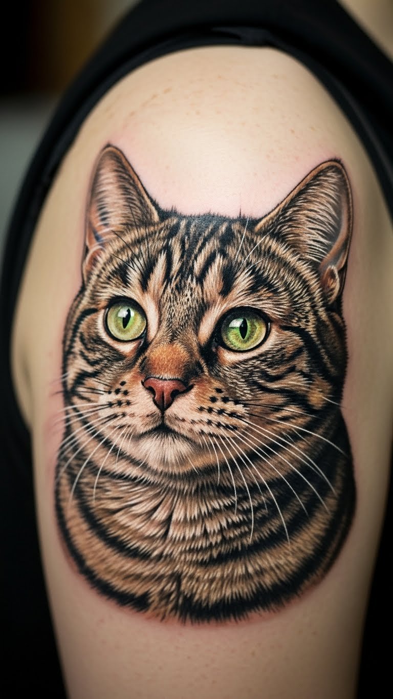 A realistic cat portrait tattoo brings your pet to life on your skin. Picture a detailed image of your cat’s face, complete with fur and eyes that pop. Use a photo of your cat as a reference to guide the artist. For DIY vibes, snap pictures with your phone and tweak them in a free app to create a template. Aim for a spot like your arm where it’s easy to show off but not too visible at work. Prices start around $100 for smaller ones, so shop for artists who offer pet specials. Keep it simple: pick a design that matches your cat’s personality, like wide eyes for a curious vibe. Apply a temporary version from online stores to try it out cheaply. Remember, good aftercare with lotion helps it heal fast. This method lets you honor your pet without breaking the bank.