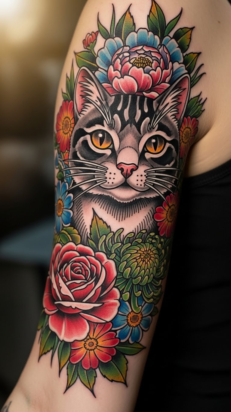 Neo-traditional cat with flowers mixes old-school art with flair. Picture a cat surrounded by colorful blooms. Sketch combinations on paper for fun. Opt for a bicep to show it off. Costs might hit $100, so find promotions. Use craft supplies to mock it up. Add your favorite flower for personality. Test with washable stamps. Basic lotions maintain the colors. It’s an expressive choice on a budget.