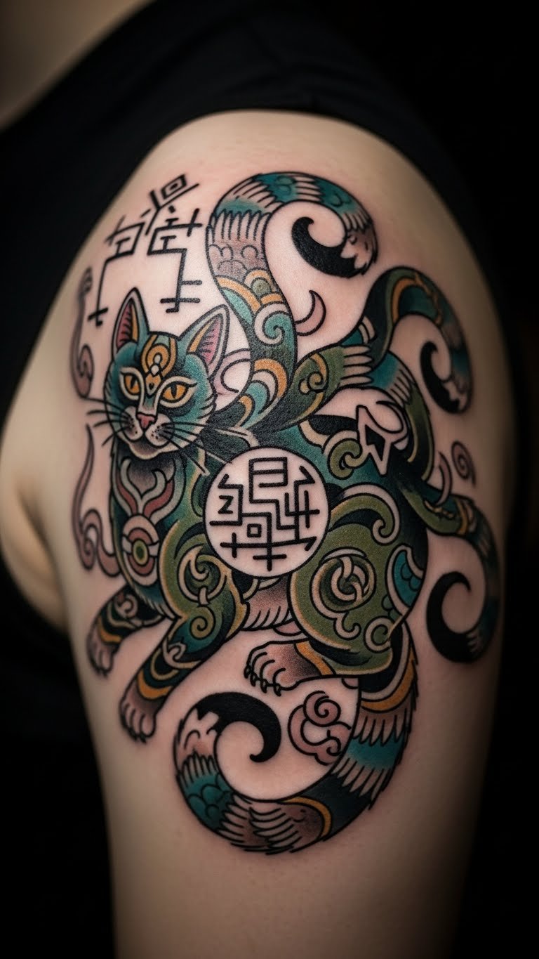 A cultural folklore cat tattoo tells a story from myths. Include elements like magical tails. Research online and sketch your version. Opt for a shoulder spot. Costs around $80, so look for themed artists. Use books for inspiration and draw it. Add local symbols for meaning. Try paper cutouts first. Care is basic, like daily checks. It’s a thoughtful way to connect.