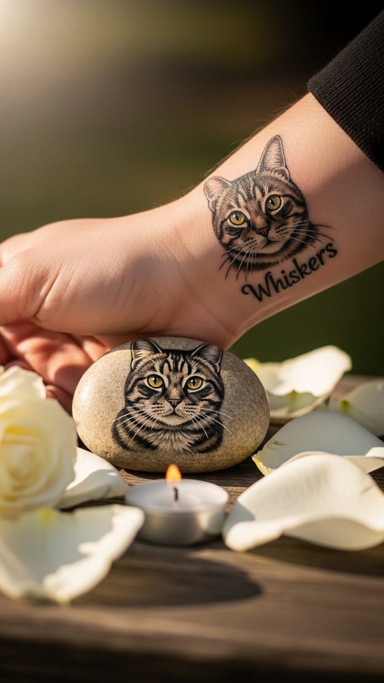 A pet memorial with name tattoo honors lost friends. Combine a cat image and their name. Use old photos to guide the design. Place on your wrist for remembrance. Prices from $60, with pet deals available. Write the name in a notebook first. Include dates for depth. Use memorial stickers as a start. Lotion keeps it clear. This offers comfort affordably.