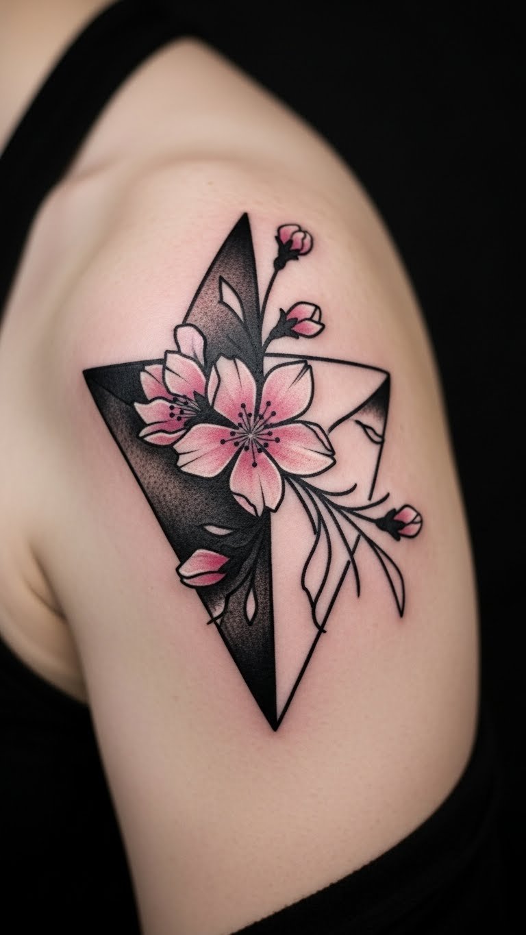 Geometric cherry blossom tattoos mix shapes with nature for a modern vibe. Picture triangles framing delicate blooms. Sketch ideas with a ruler and pencil from your drawer. It’s a cheap way to experiment. Draw on paper first to align patterns. Real DIY example: Use graph paper to plot designs at home. This keeps costs low. Add bold lines for impact. Focus on balance and symmetry. A quick home session lets you refine before ink. Try free online shape tools for inspiration. This approach makes the process straightforward.