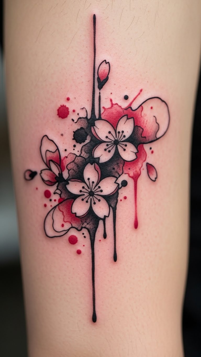 Abstract ink blot cherry blossom tattoos create artistic blur. Think smeared petals for uniqueness. Experiment with ink blots on paper at home. Use water and paint you own. Real idea: Blot designs quickly for effects. It’s budget-friendly. Add abstract twists. Focus on creativity in your trial.