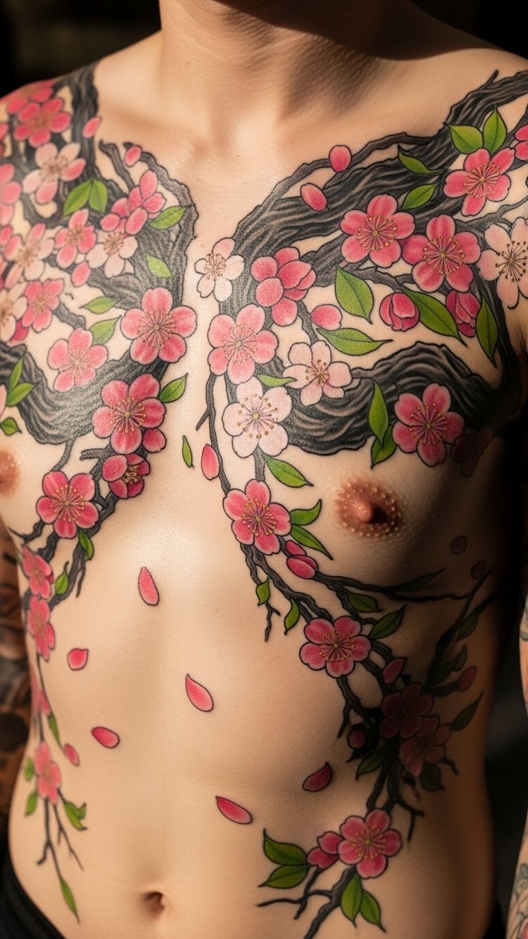 Large chest cherry blossom tattoos cover big areas. Plan with big sketches. Draw at home. Real idea: Outline on paper first. Focus on fit.