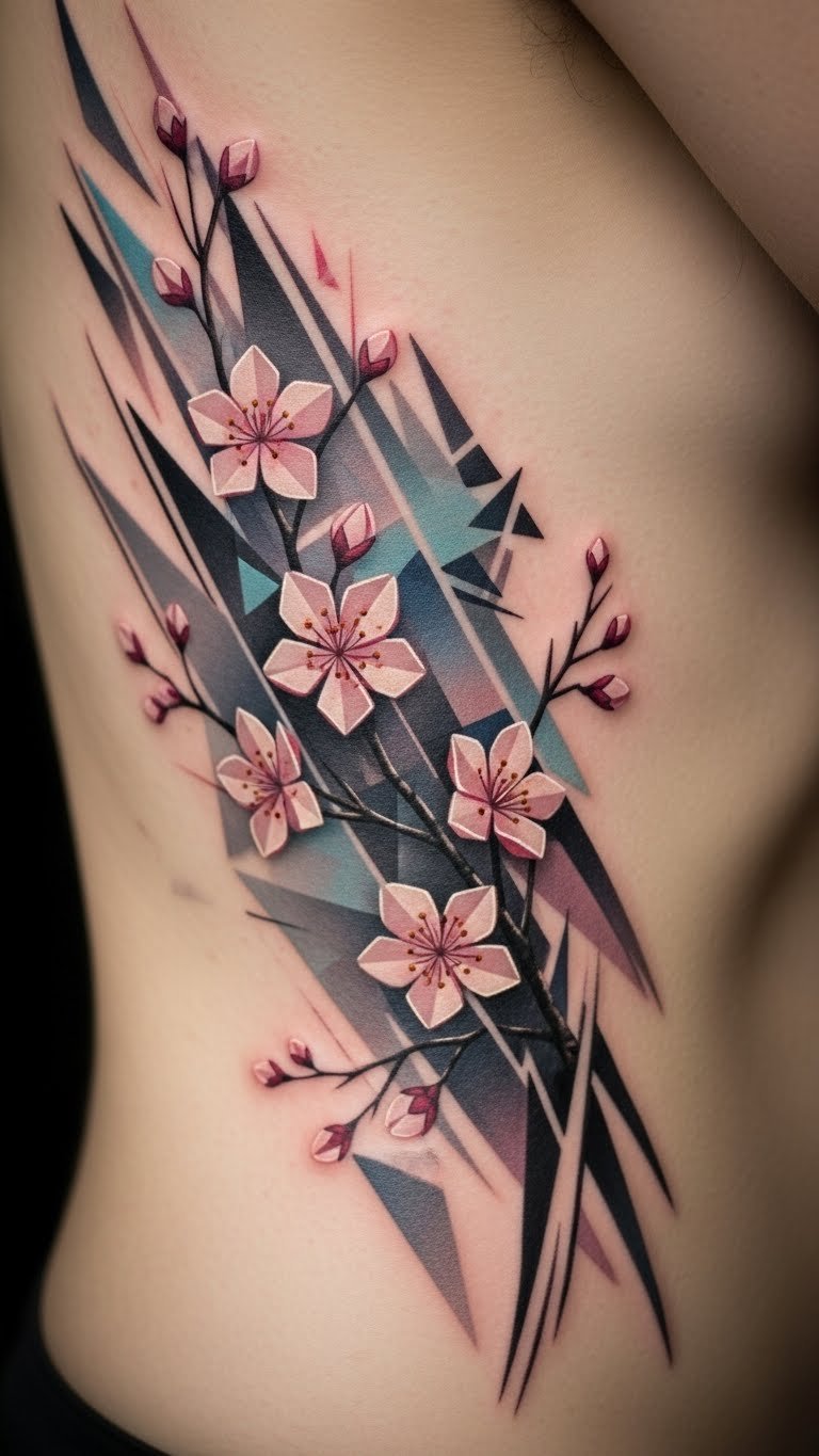 Modern abstract cherry blossom tattoos twist tradition. Draw abstract versions. Use creative tools. Real idea: Experiment on paper. Keep it fresh.