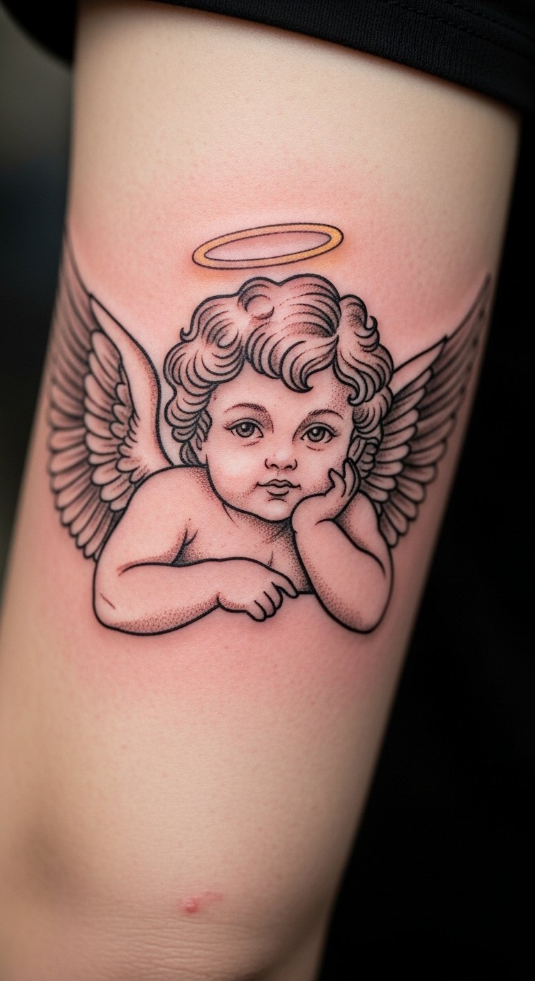 Cherub tattoos with halos bring a sense of pure light. Picture a small design on your wrist. It shows protection in a simple way. Start with a sketch on paper. Use free online tools to add a halo. Keep costs low by visiting local artists during sales. Try drawing your own version at home with markers. Bold details like the halo stand out. This tattoo reminds you of safety every day. Place it where you see it often. Go for black ink to save money. Add personal touches like a tiny star. These steps make the process fun and easy. Focus on what matters most to you.