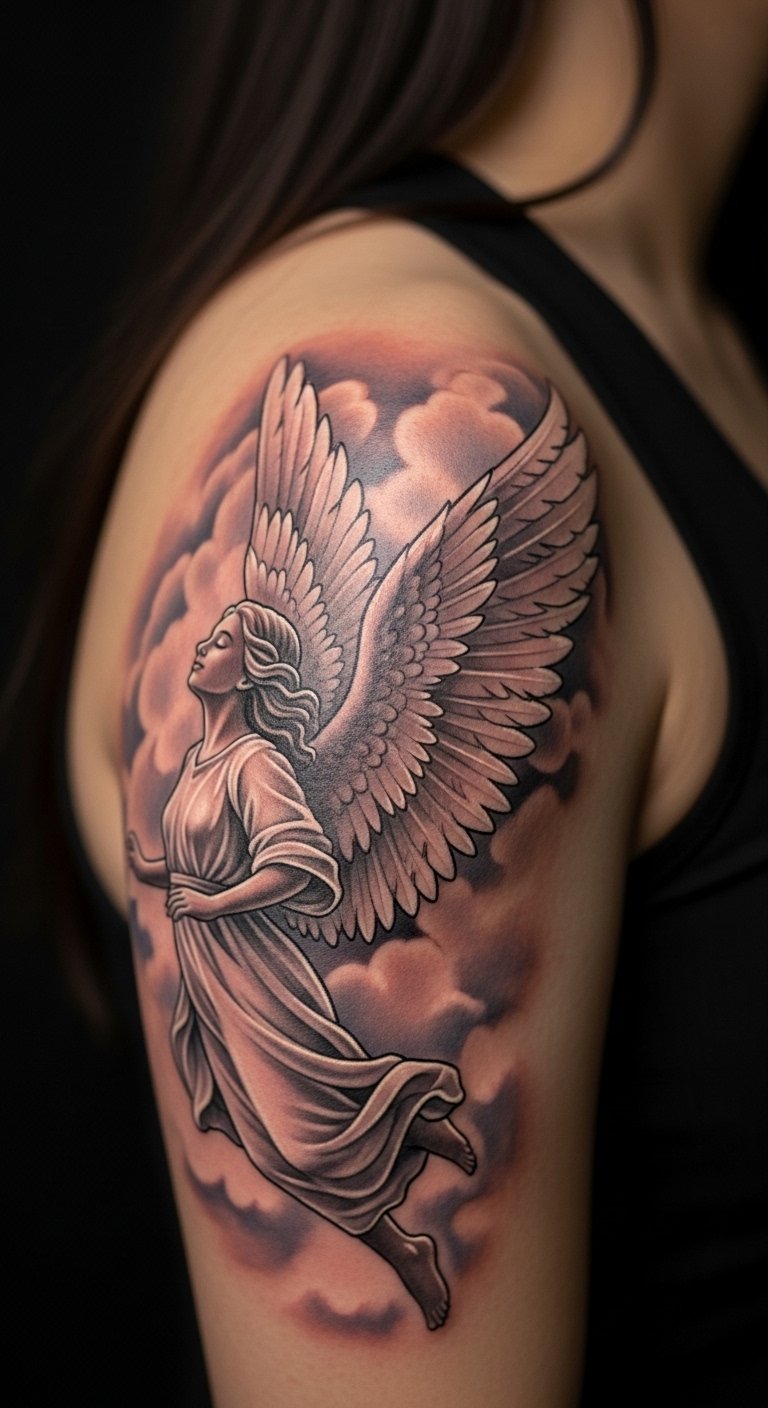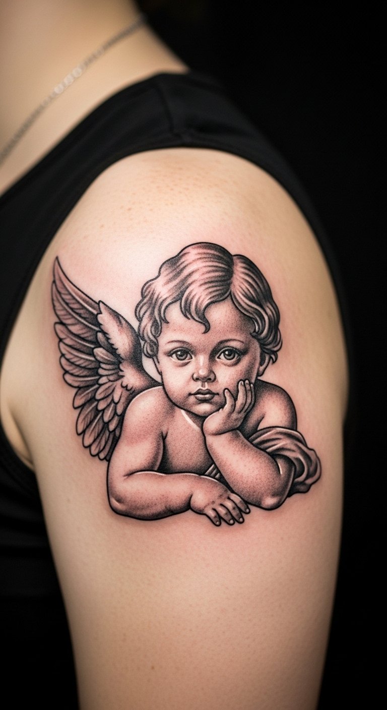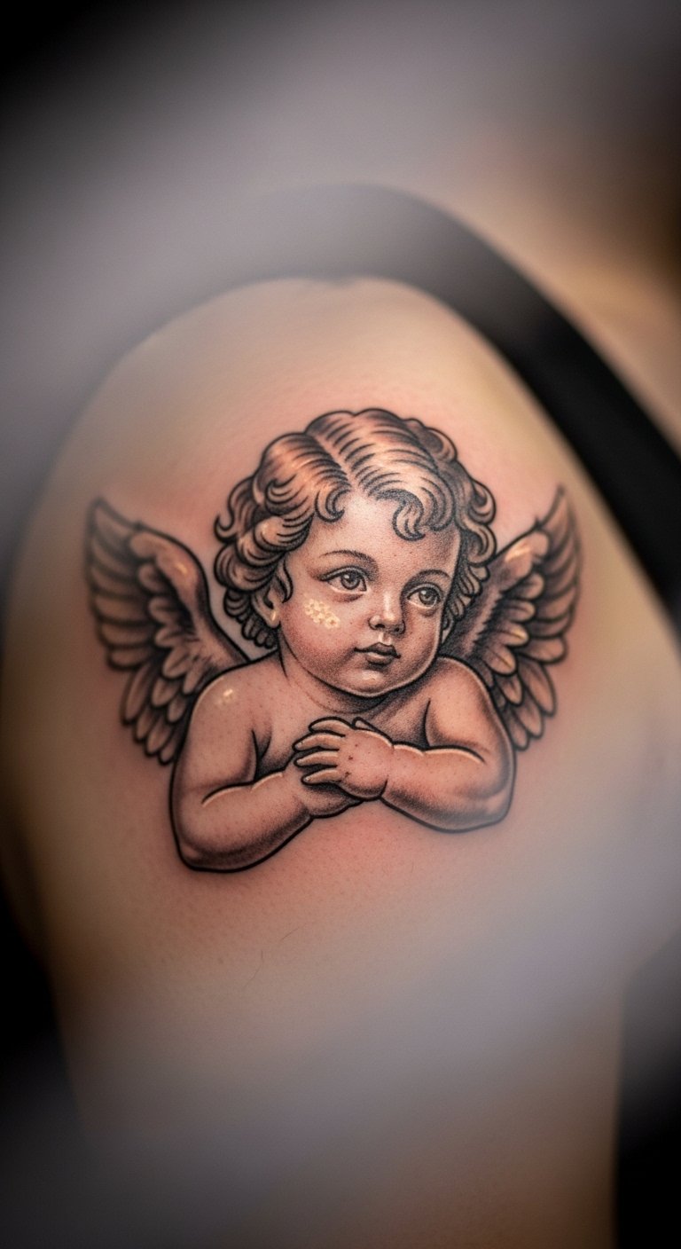 Hidden shoulder cherub tattoos offer privacy. Tuck it away for discretion. It holds quiet significance. Map your shoulder first. Use phone cameras for views. Sketch lightly. Customize simply. Bold the hidden spot. Find low-cost pros. Practice hiding it. This adds intimacy.