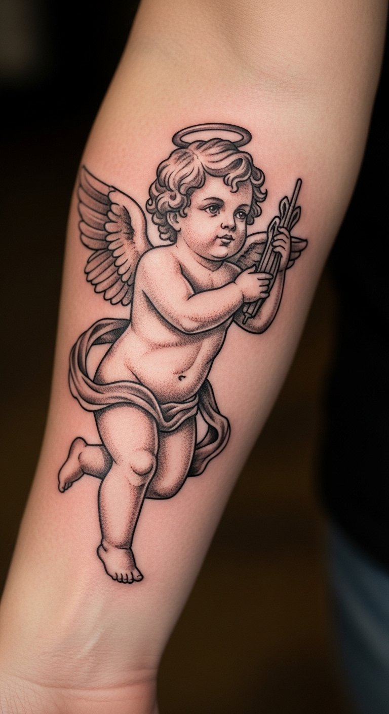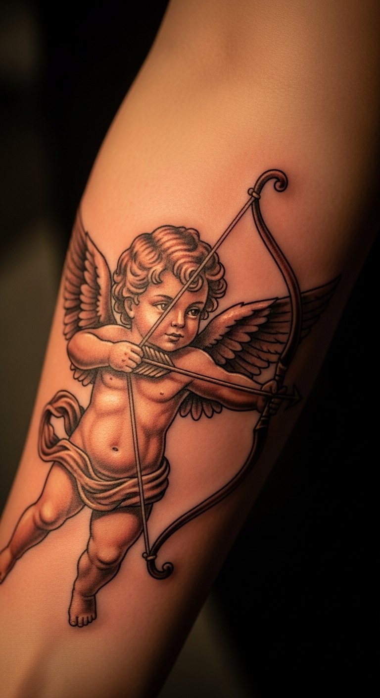 Arrow-wielding cherub tattoos express deep affection. Imagine this on your ankle for a subtle touch. It captures love’s playful side. Sketch arrows on paper to start. Find free templates online for inspiration. Visit community art classes for advice. Add hearts to your design at no extra cost. Bold the arrow for key focus. Keep the style simple to save time. Use colored pencils for home trials. This approach makes tattooing approachable. Choose spots that show your story.