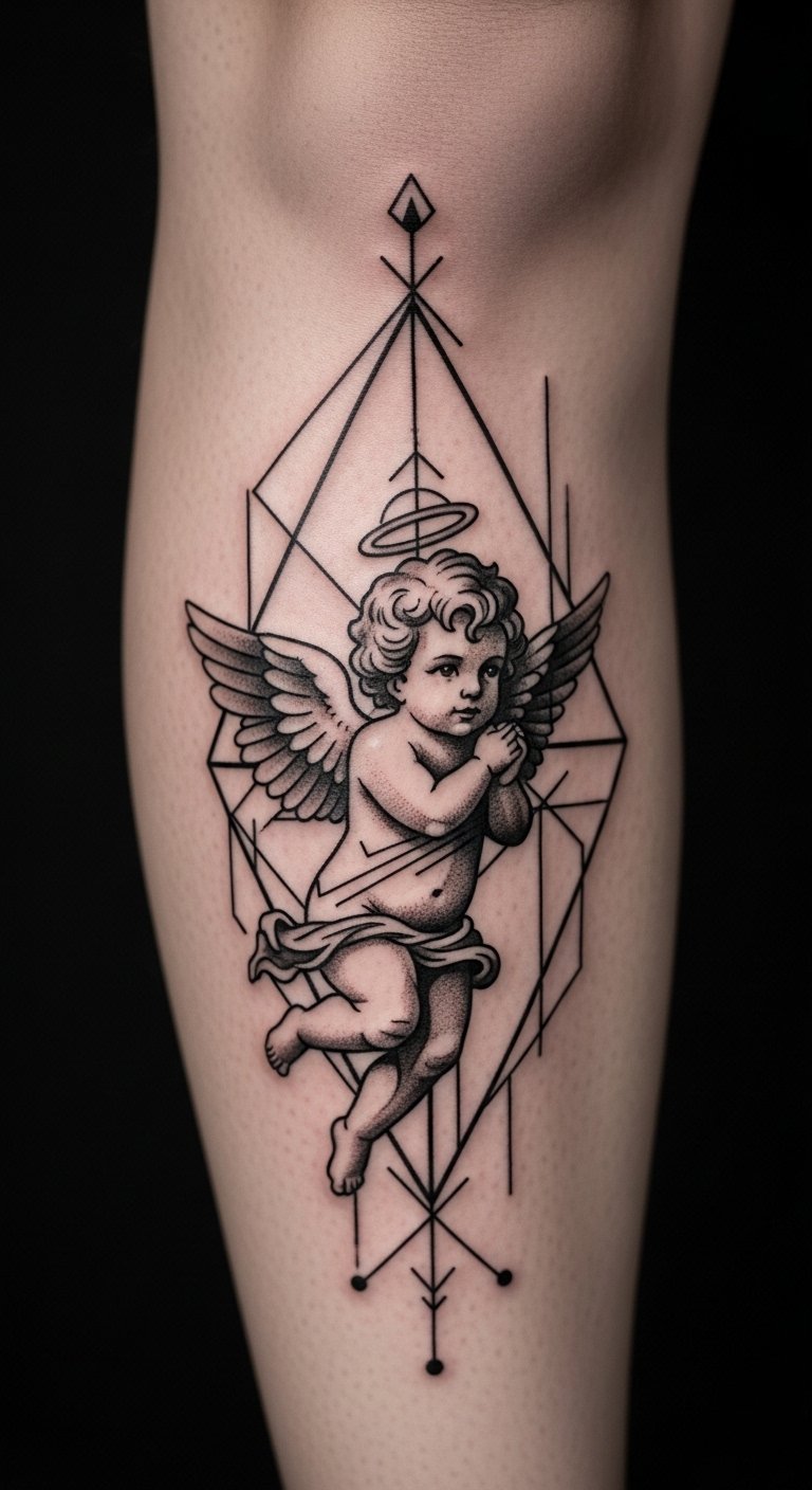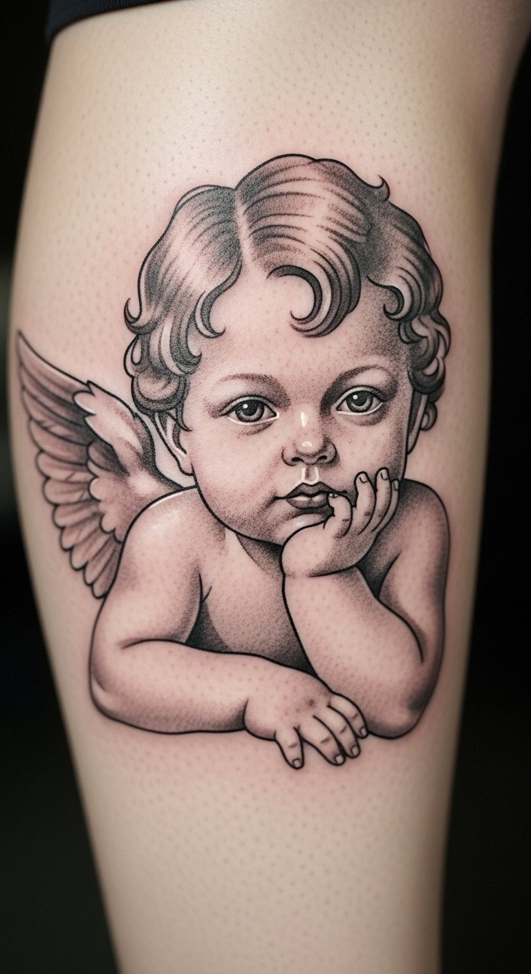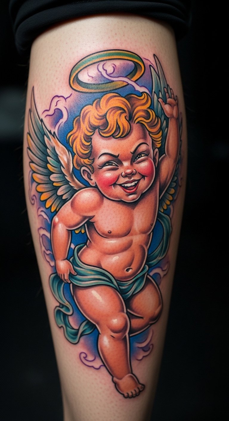 Modern cherub tattoos update traditions. Put it on your thigh. It mixes old and new. Blend shapes in sketches. Use digital tools freely. Add modern twists. Keep it bold. Bold the lines. Select affordable updates. Try variations. This refreshes the look.