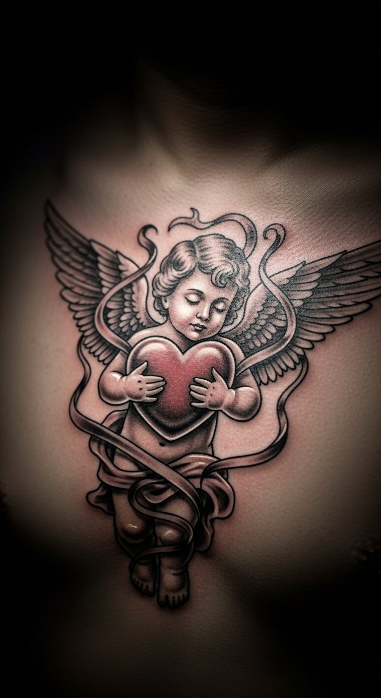 Heart cherub tattoos honor lost ones. Put it on your forearm as a tribute. It symbolizes eternal connection. Start with heart sketches in a notebook. Download free memorial templates online. Attend local workshops for pointers. Add names using basic tools. Bold the heart element for impact. Opt for black and gray to save money. Practice on paper first. This tattoo becomes a quiet story.