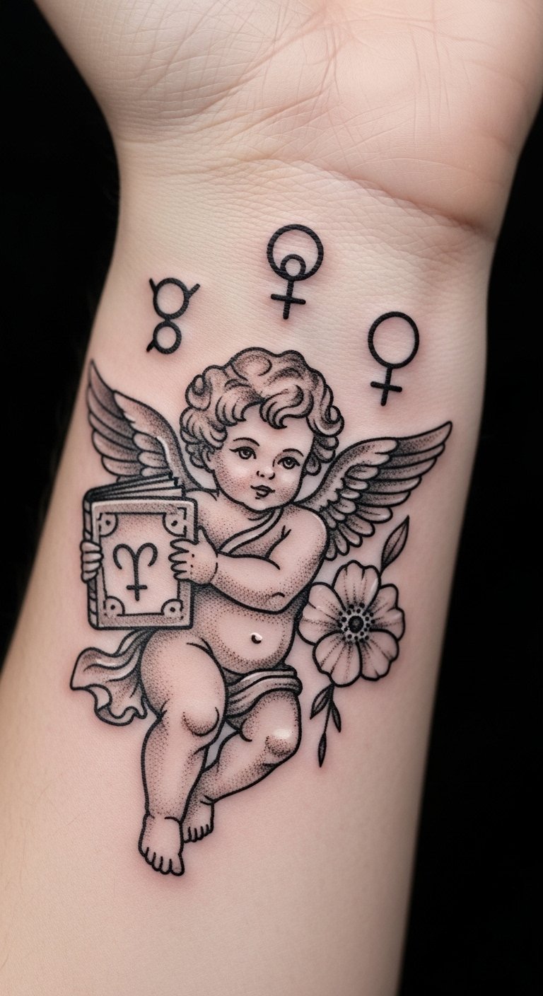 Winged cherub tattoos add a cheeky vibe. Try this on your thigh for flair. It mixes fun with tradition. Sketch playful poses at your desk. Use free software to tweak the wings. Check online forums for ideas. Add extra details with markers. Bold the mischievous parts. Keep it compact for quick work. Test with stick-on tattoos. This design sparks joy easily.