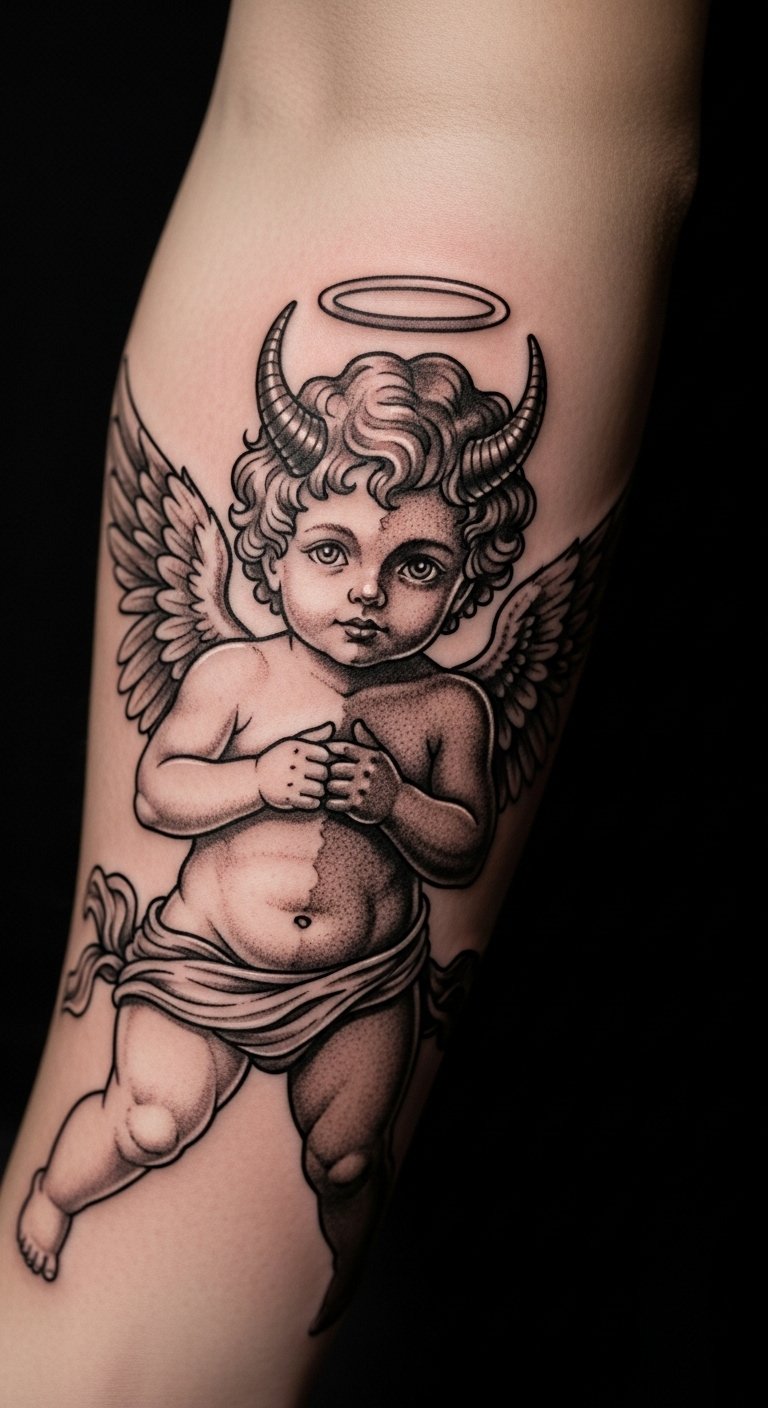 Duality cherub tattoos show life’s contrasts. Wear it on your bicep for strength. It blends light and dark. Mix simple shapes in sketches. Find free duality ideas online. Experiment at home with markers. Add horns or halos easily. Bold the contrast points. Opt for basic ink. Test designs temporarily. This approach adds depth without fuss.