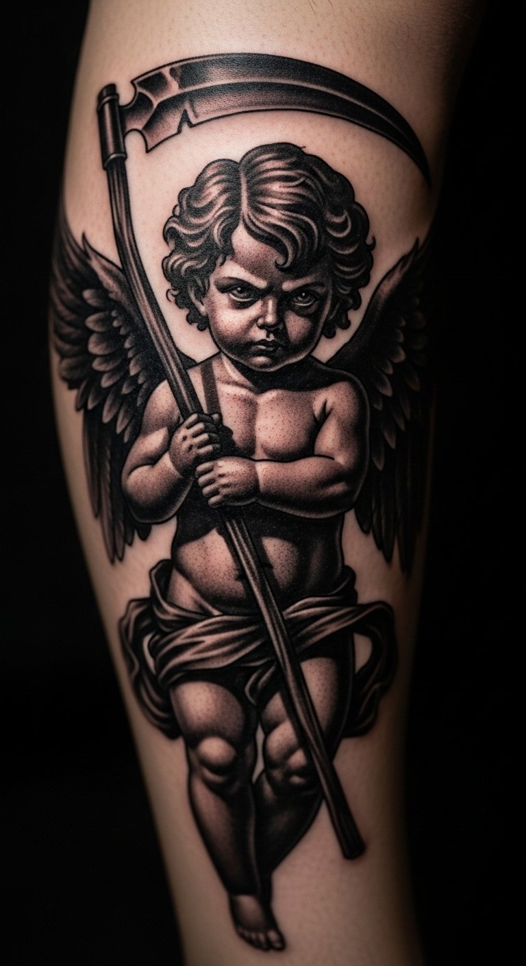 Dark cherub tattoos explore deeper themes. Place it on your calf for impact. It represents inner strength. Draw scythes on paper. Use apps for dark effects. Look for inspiration in affordable books. Add shadows with ease. Bold the fierce aspects. Keep sizes modest. Practice with home tools. This design empowers you.
