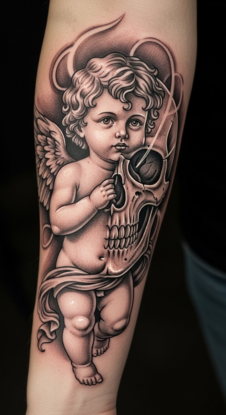 Skull cherub tattoos merge life and mystery. Put it on your arm for meaning. It tells a bold story. Combine sketches simply. Find free fusion templates. Try home drawing sessions. Add skulls effortlessly. Bold the integrated parts. Go for affordable options. Use temporary versions. This tattoo speaks volumes.