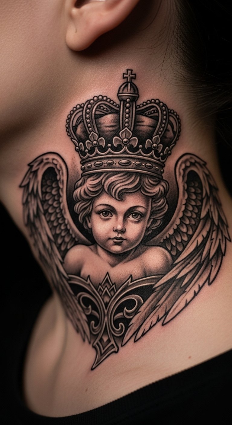 Crown cherub tattoos signify strength. Wear it on your neck subtly. It embodies power. Draw crowns at home. Use online resources for details. Practice with basic supplies. Add wings easily. Bold the crown feature. Keep it simple. Experiment first. This design inspires confidence.