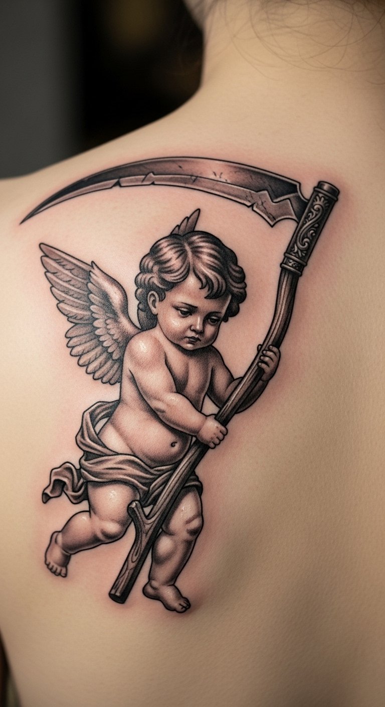 Scythe cherub tattoos convey resolve. Place it on your upper back. It adds a strong element. Sketch tools on paper. Access free design sites. Build from simple ideas. Incorporate details affordably. Bold the scythe. Opt for straightforward styles. Try mock-ups. This makes it personal.