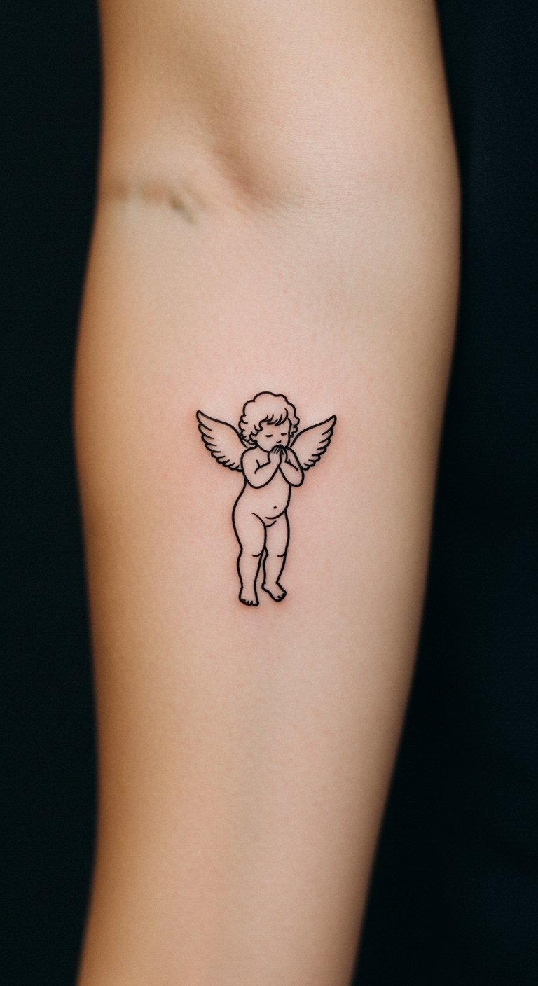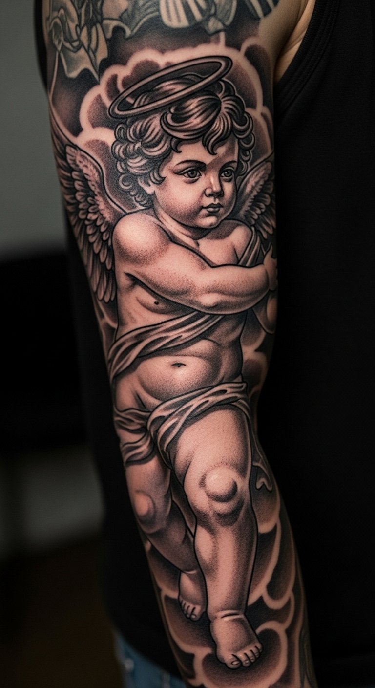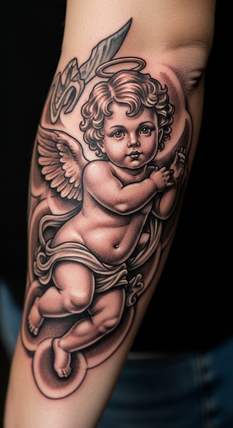 Arm cherub tattoos stay in view. Choose your bicep for daily sight. It keeps memories close. Plan spots carefully. Use mirrors for trials. Draw options freehand. Add personal flair. Bold the placement. Select budget artists. Test positions. This ensures satisfaction.