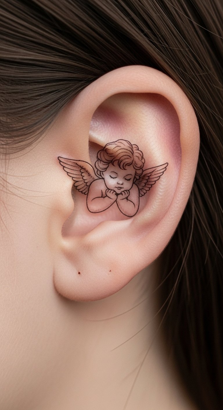 Ear cherub tattoos are discreet charms. Place it behind your ear. It whispers stories. Draw tiny versions. Use apps for precision. Check for pain spots. Add small touches. Bold the ear idea. Go for quick sessions. Use stickers first. This keeps it easy.