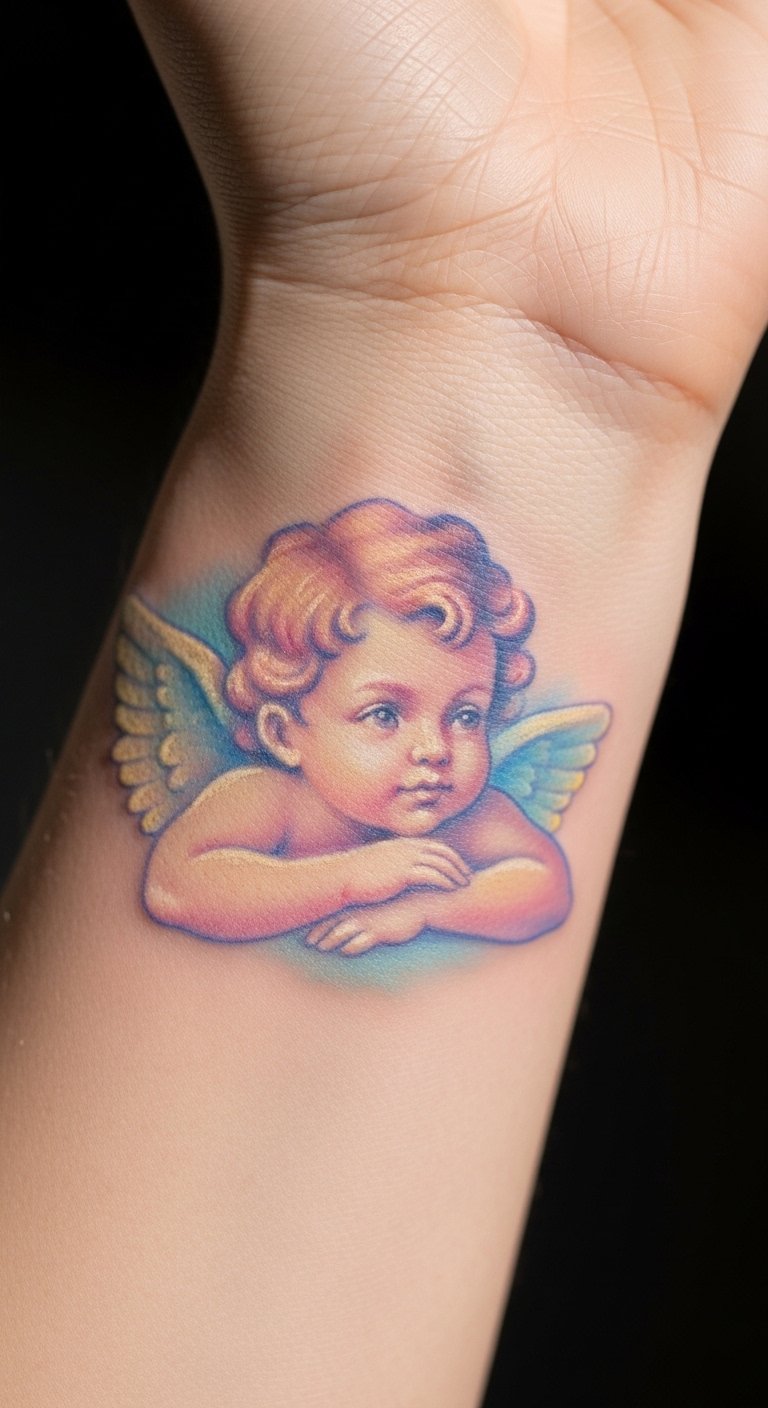 Pastel cherub tattoos bring color gently. Wear it on your wrist. It adds a soft glow. Mix colors at home. Find free palettes online. Experiment with crayons. Layer shades simply. Bold the pastel tones. Choose economical inks. Test blends. This enhances appeal.