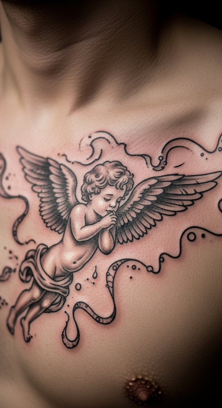 Cloud cherub tattoos create a dreamy scene. Try this on your shoulder blade. It feels light and fun. Sketch clouds quickly. Use free programs to position the cherub. Gather ideas from nature walks. Add stars for free. Bold the playful clouds. Choose quick designs. Test on skin-safe paper. This makes tattooing enjoyable.