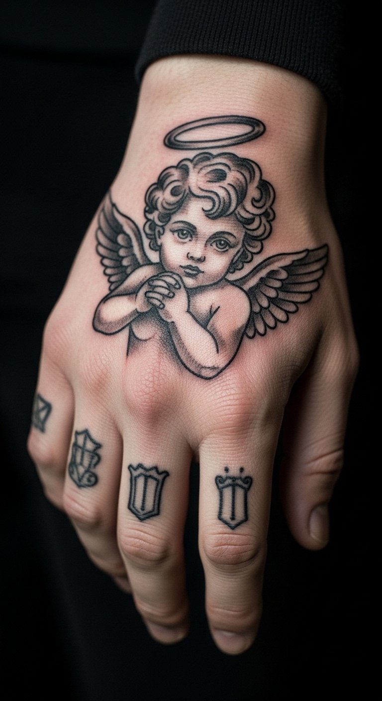 Identity cherub tattoos reflect you. Place it on your hand. It expresses core. Define traits. Sketch representations. Add marks. Bold expressions. Go for meaningful. Try drafts. This honors self.