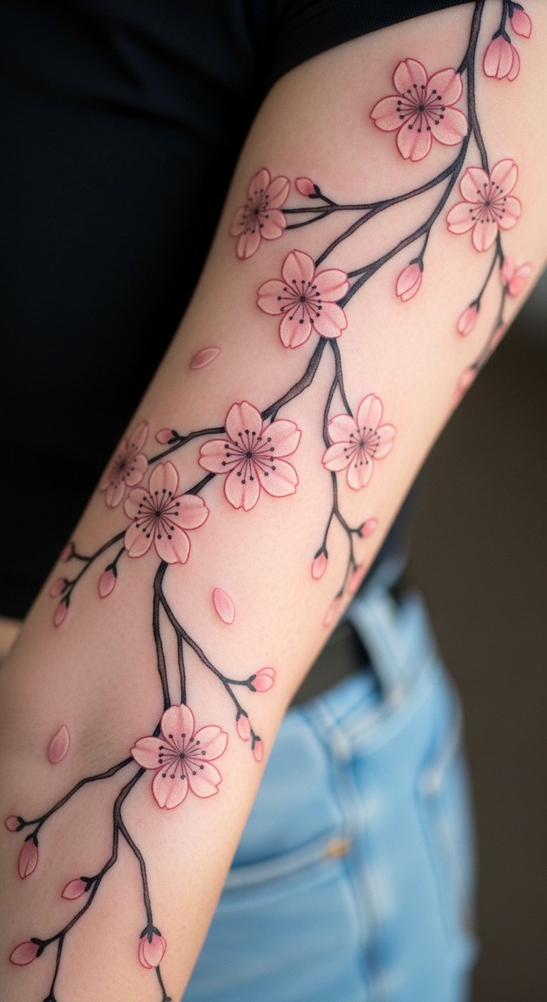 Cherry blossoms mean beauty and change. A sleeve tattoo covers your arm fully. It looks elegant and feminine. Start with a temporary sticker. You can buy packs for $1. Draw petals on paper to plan. Use free apps for digital designs. Add your own twists, like extra leaves. This saves on professional costs. Visit a local shop for the final step. Many have sales under $200. Keep the flowers light and natural. Focus on curves and clusters. Your tattoo can symbolize fleeting moments. Try a DIY with fabric paints on clothes. It costs nothing extra. Practice makes it perfect. Get feedback from friends. A cherry blossom sleeve feels personal.