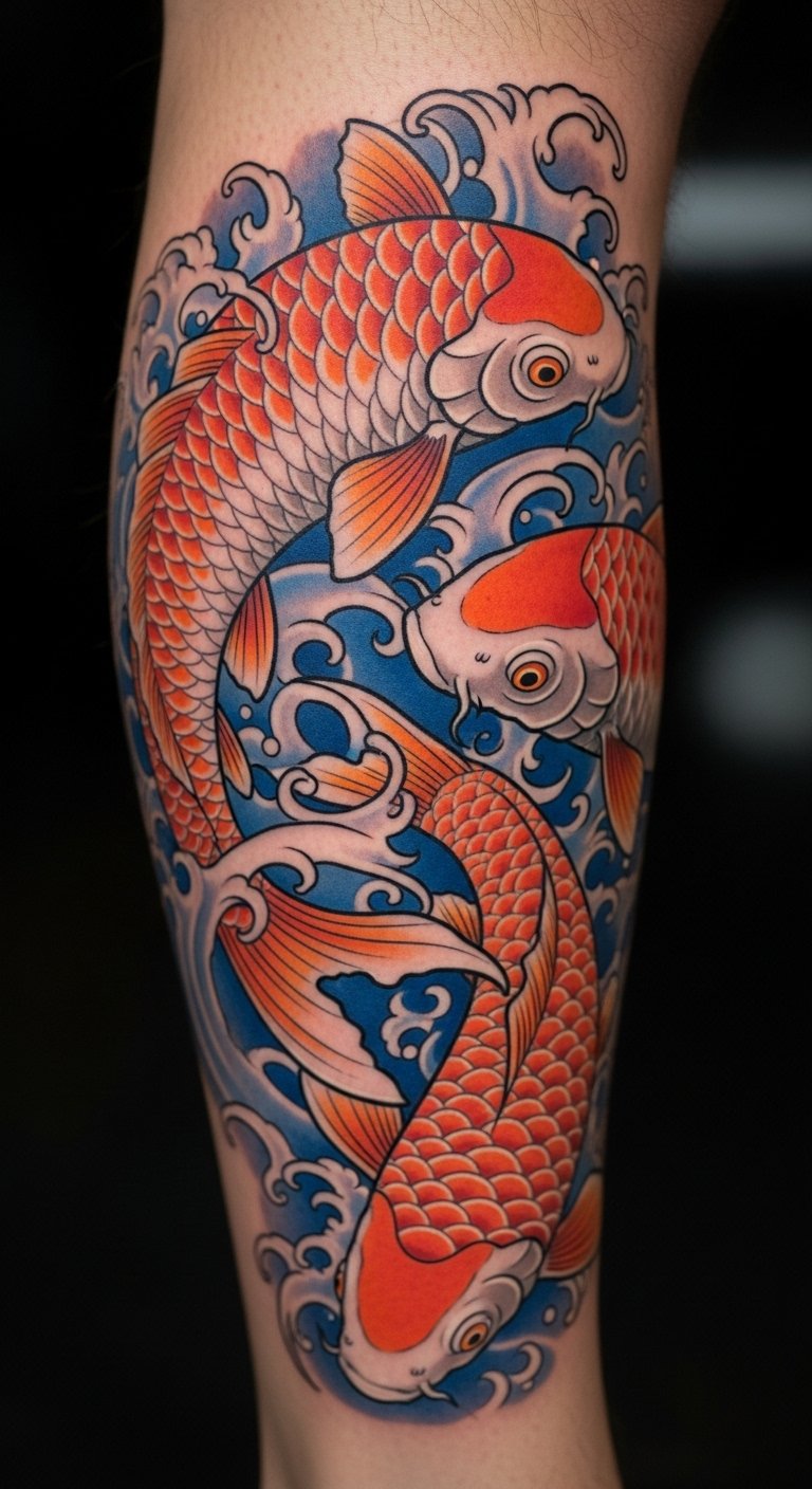 Koi fish represent perseverance. A swim design fits on your calf perfectly. It moves with you. Start with fish templates online. Print them for free. Draw the fish on paper first. Add waves around them. This keeps costs low. Find tattoo sales in the area. Options begin at $70. Keep the fish lively and scaled. Focus on the direction. Your koi can symbolize goals. Try a DIY with string art at home. Use household items. Practice the shapes. Ask friends for thoughts. A koi swim inspires.