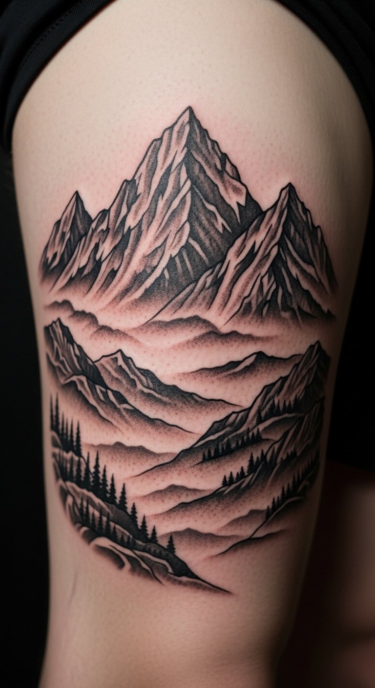 Mountain landscapes symbolize stability. A scene on your thigh covers nicely. It’s adventurous and vast. Start with landscape drawings online. Sketch them freehand. Add peaks with markers. This keeps it cheap. Search for local tattoo deals. Options are around $80. Keep the mountains layered and detailed. Focus on the horizons. Your scene can mean strength. Try a DIY with sand art. Use beach sand. Practice the layers. Ask for opinions. A mountain scene grounds you.