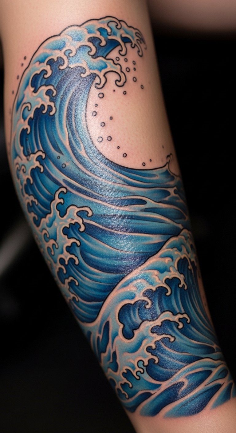 Water waves represent flow. A pattern on your leg flows beautifully. It’s calming and dynamic. Start with wave drawings. Use free apps. Add crests with pens. This keeps it affordable. Look for tattoo sales. Options start at $70. Keep the waves continuous and layered. Focus on the movement. Your pattern can mean adaptability. Try a DIY with watercolors. Use old paints. Practice blending. Ask for thoughts. A water wave soothes.