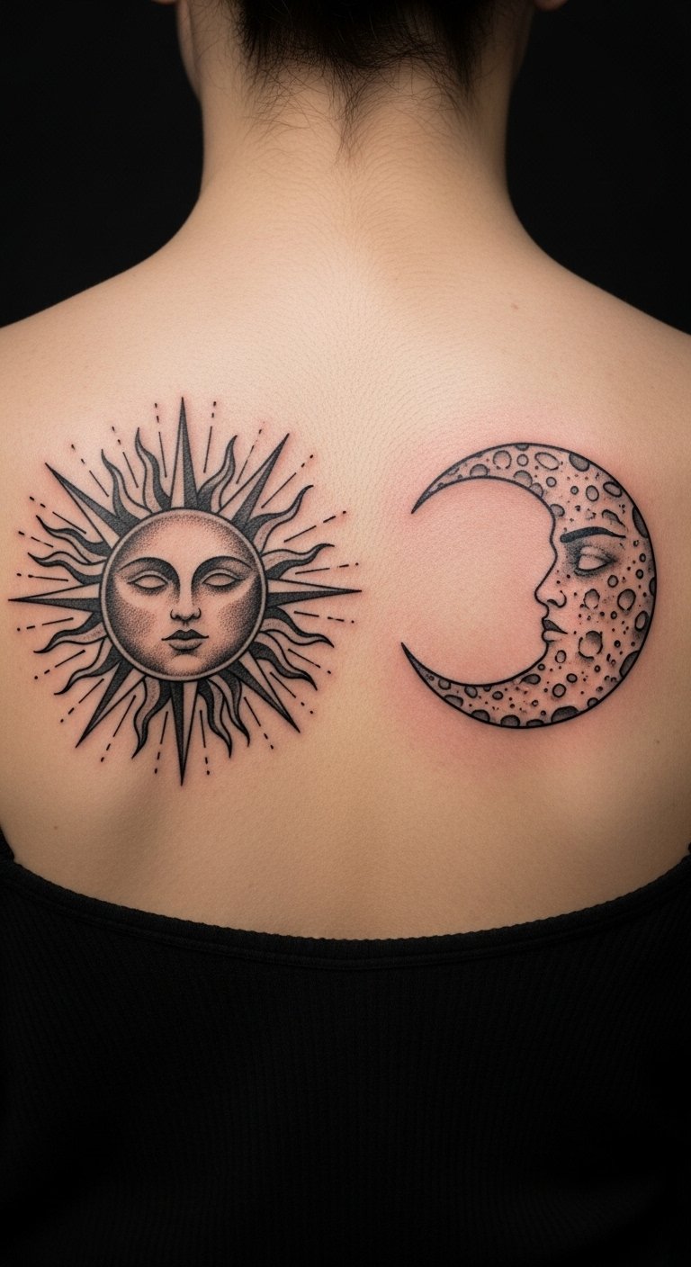 Sun and moon combos show duality. Place them on your back for balance. It’s harmonious and striking. Use celestial stencils. Draw on paper. Add details with colors. This tests cheaply. Find artist offers. Some are under $80. Keep the combo aligned and vivid. Focus on the shapes. Your design can mean cycles. Try a DIY with stickers. Use household ones. Practice placing. Get feedback. A sun and moon unite.
