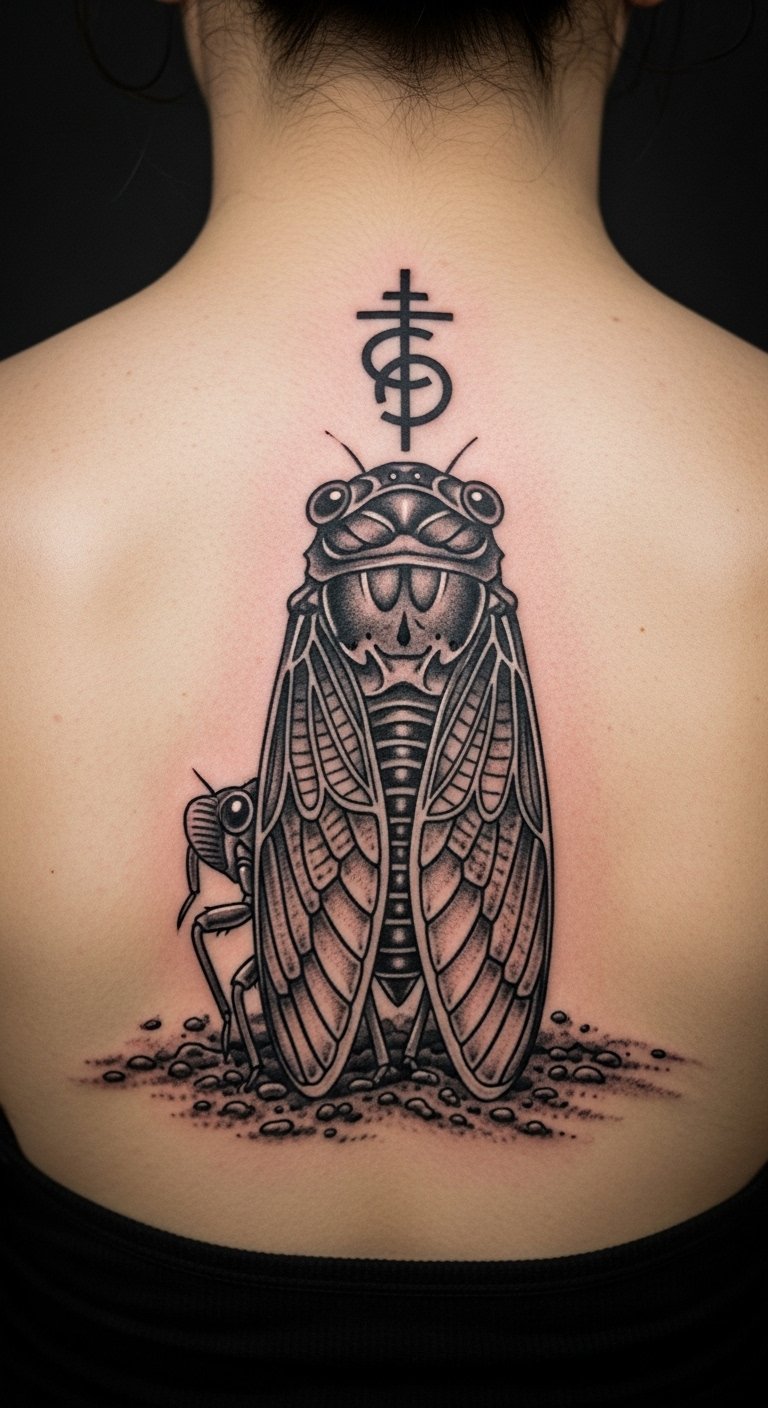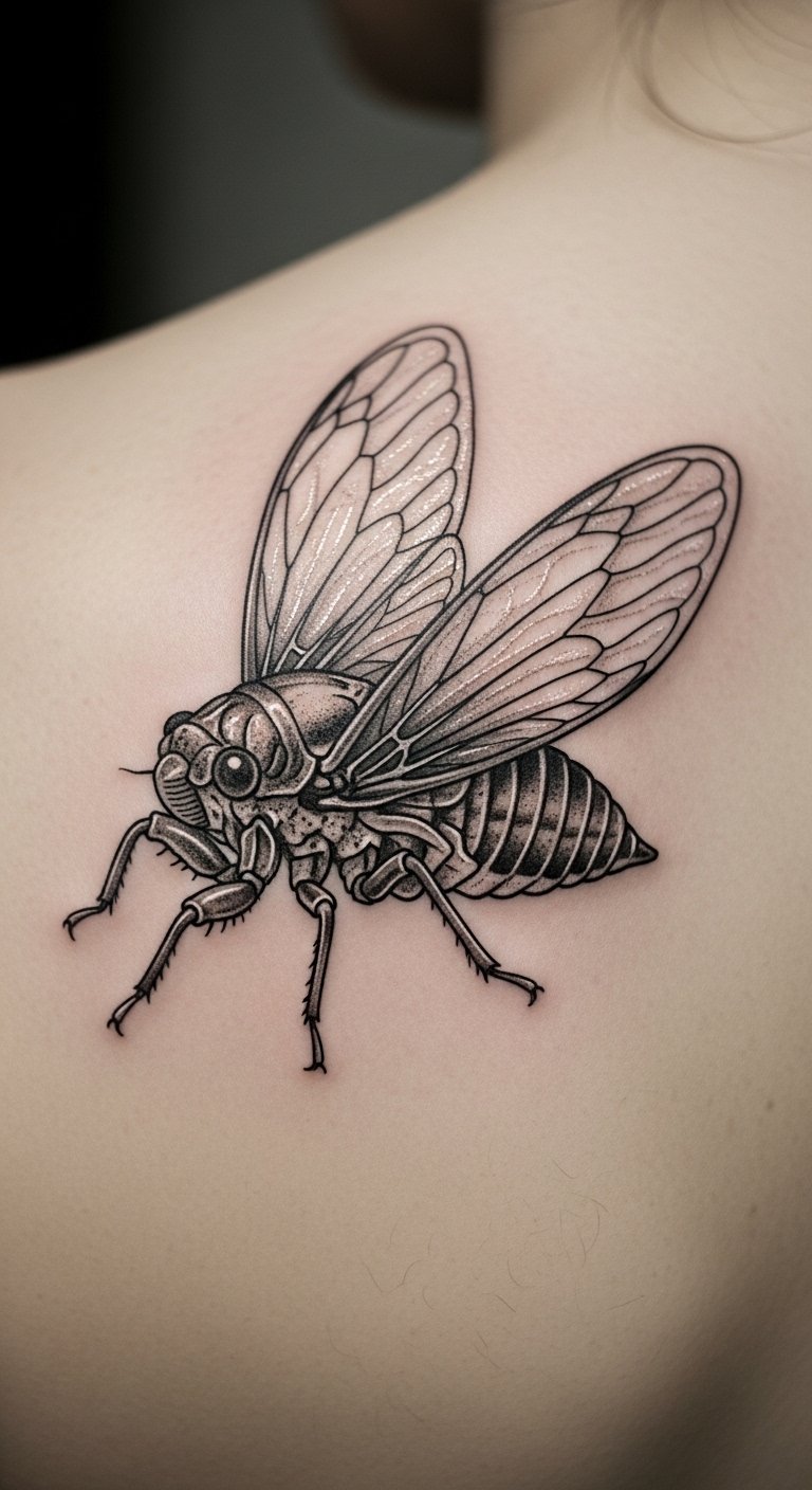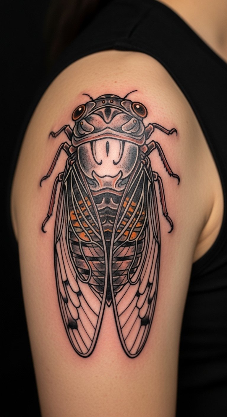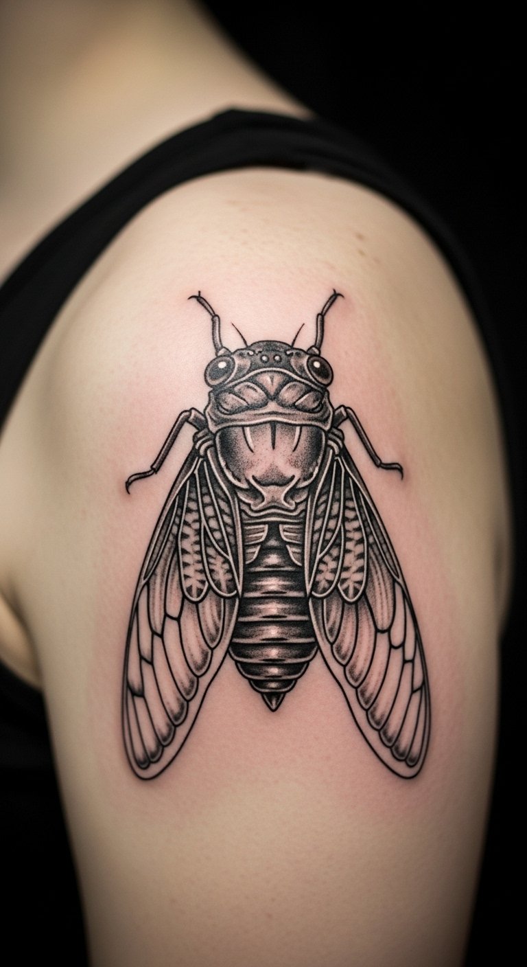 Position it for strength. Shoulder cicada ink stands out. It marks transitions.