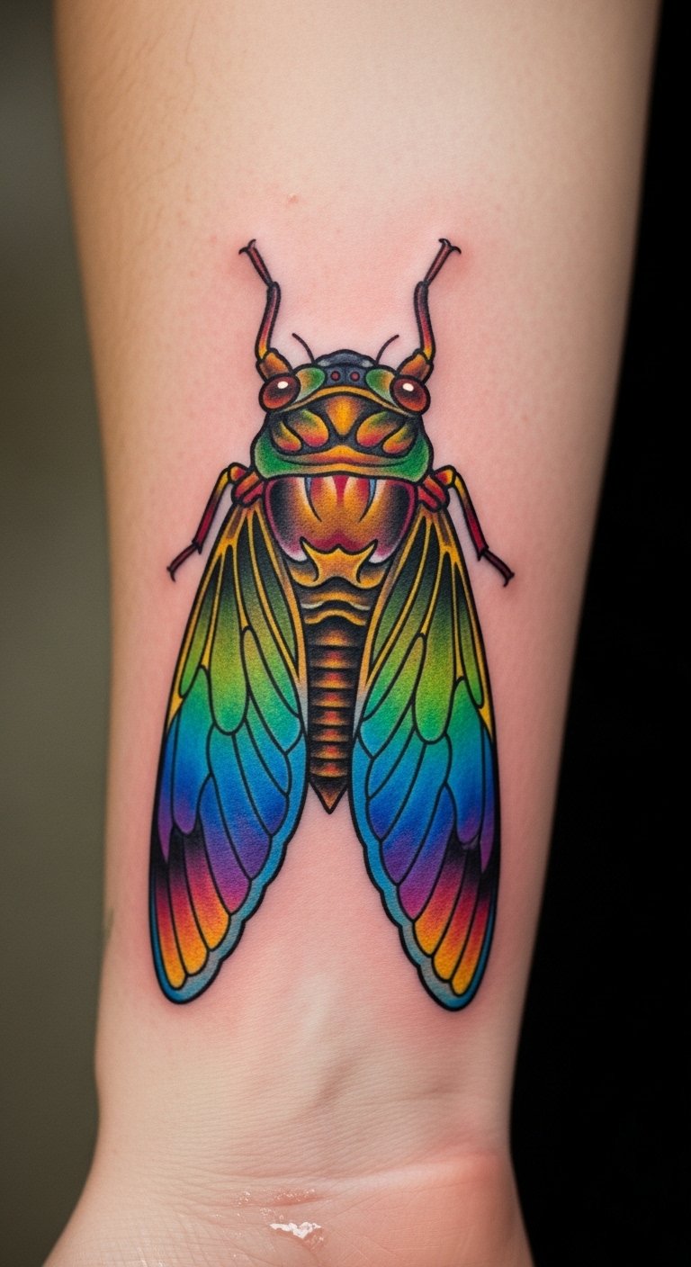 Bring some color to your ink. A colorful cicada pops with bright shades. It symbolizes good luck and energy.