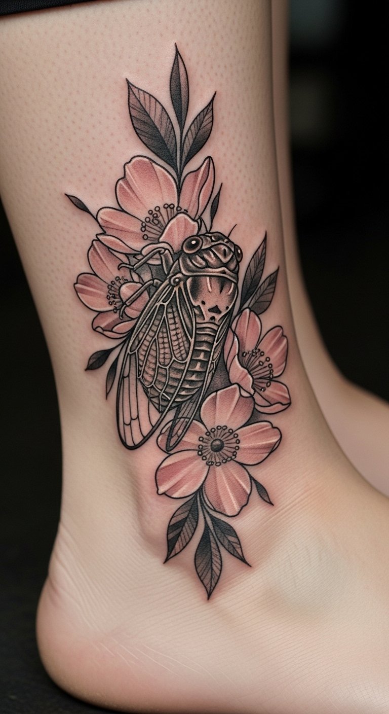 Combine nature’s best. A cicada with flowers adds floral elements for deeper symbolism. It speaks of renewal and beauty.