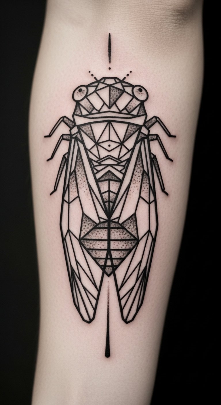 Make it modern with shapes. A geometric cicada uses angles and lines. It represents strength in a stylish way.