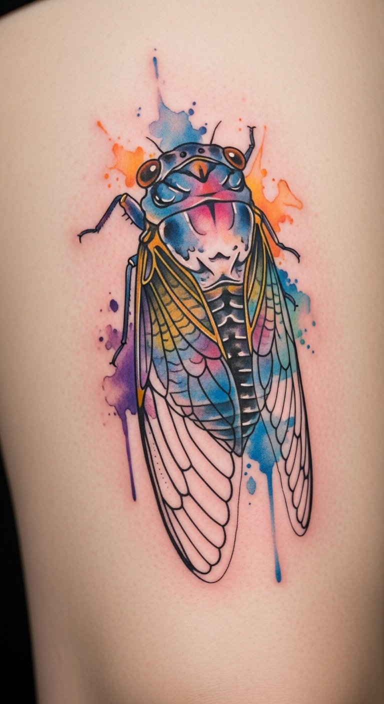 Get an artistic splash. A watercolor cicada mimics paint strokes. It evokes transformation with soft hues.