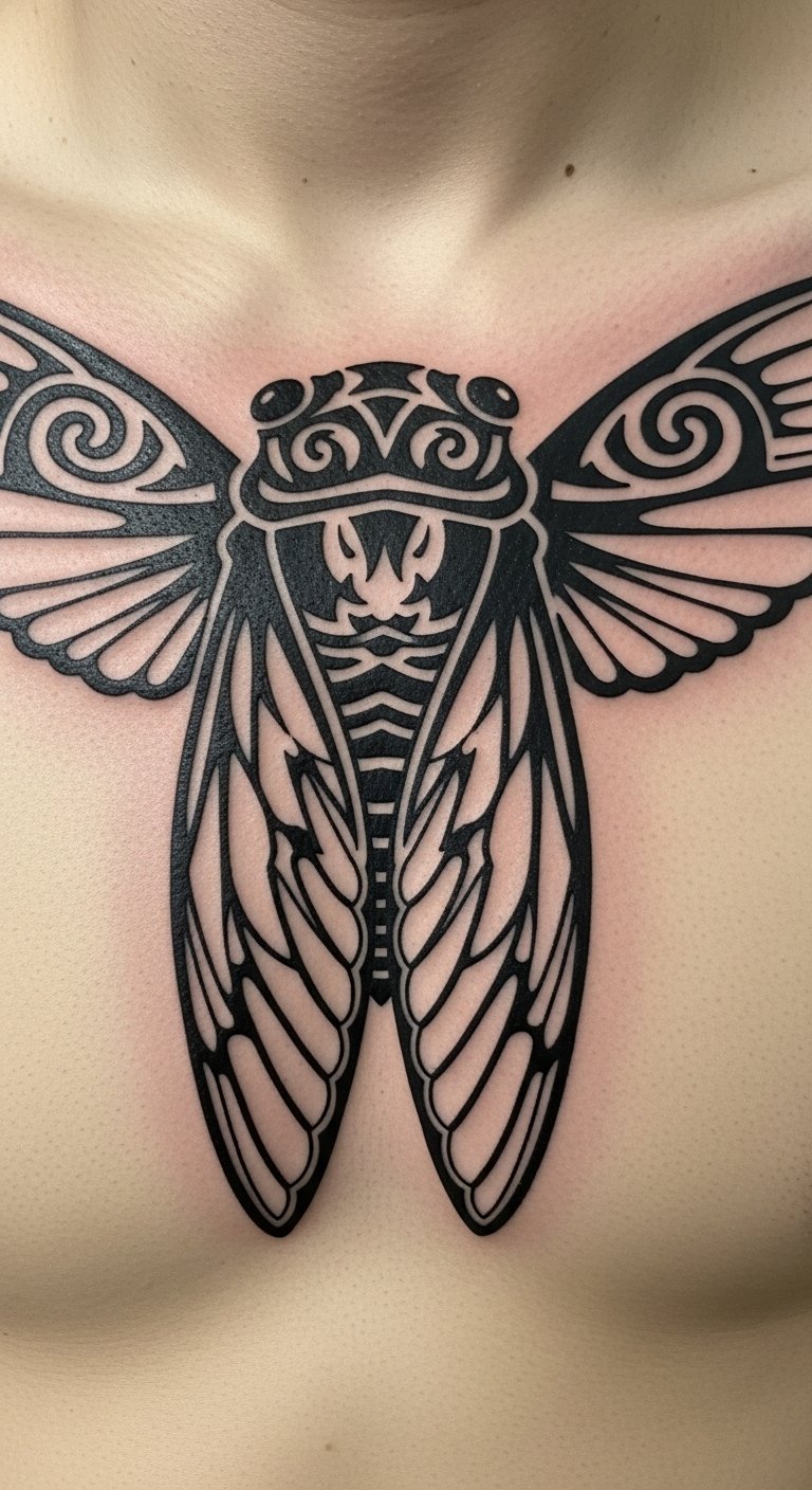 Draw from ancient vibes. A tribal cicada uses bold patterns. It stands for resilience and roots.