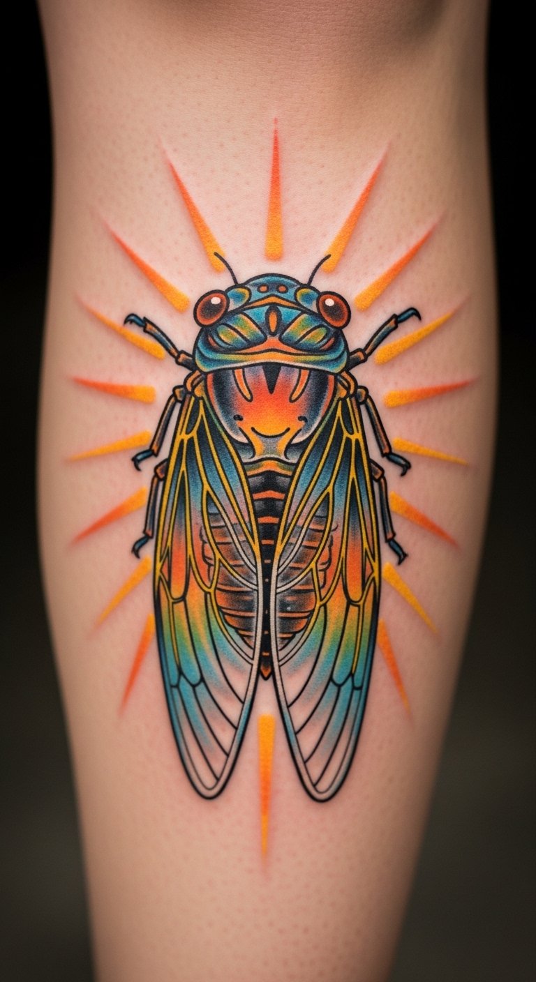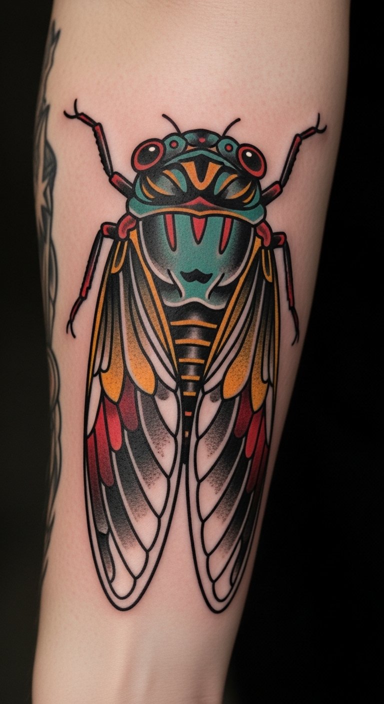 Revive old-school cool. Neo-traditional cicada adds flair. It blends history with now.