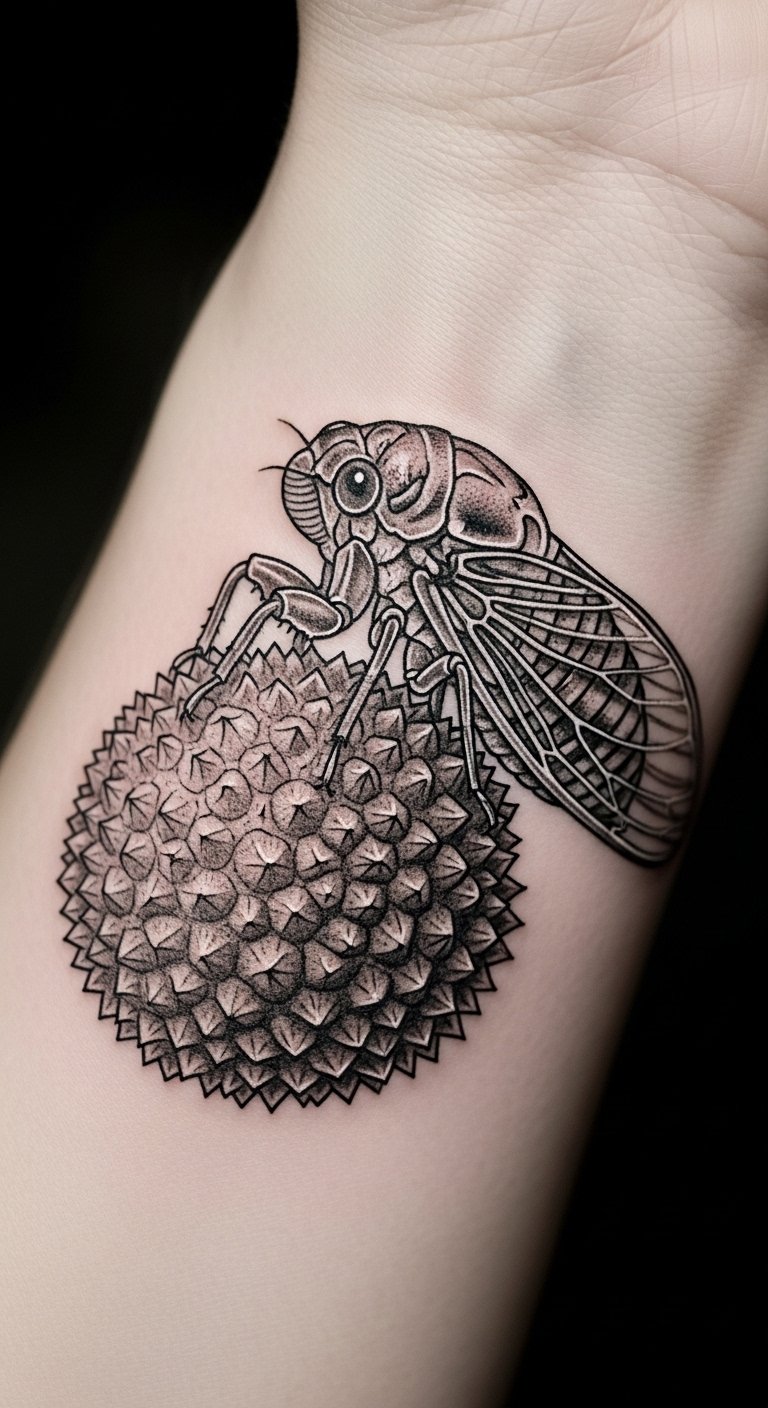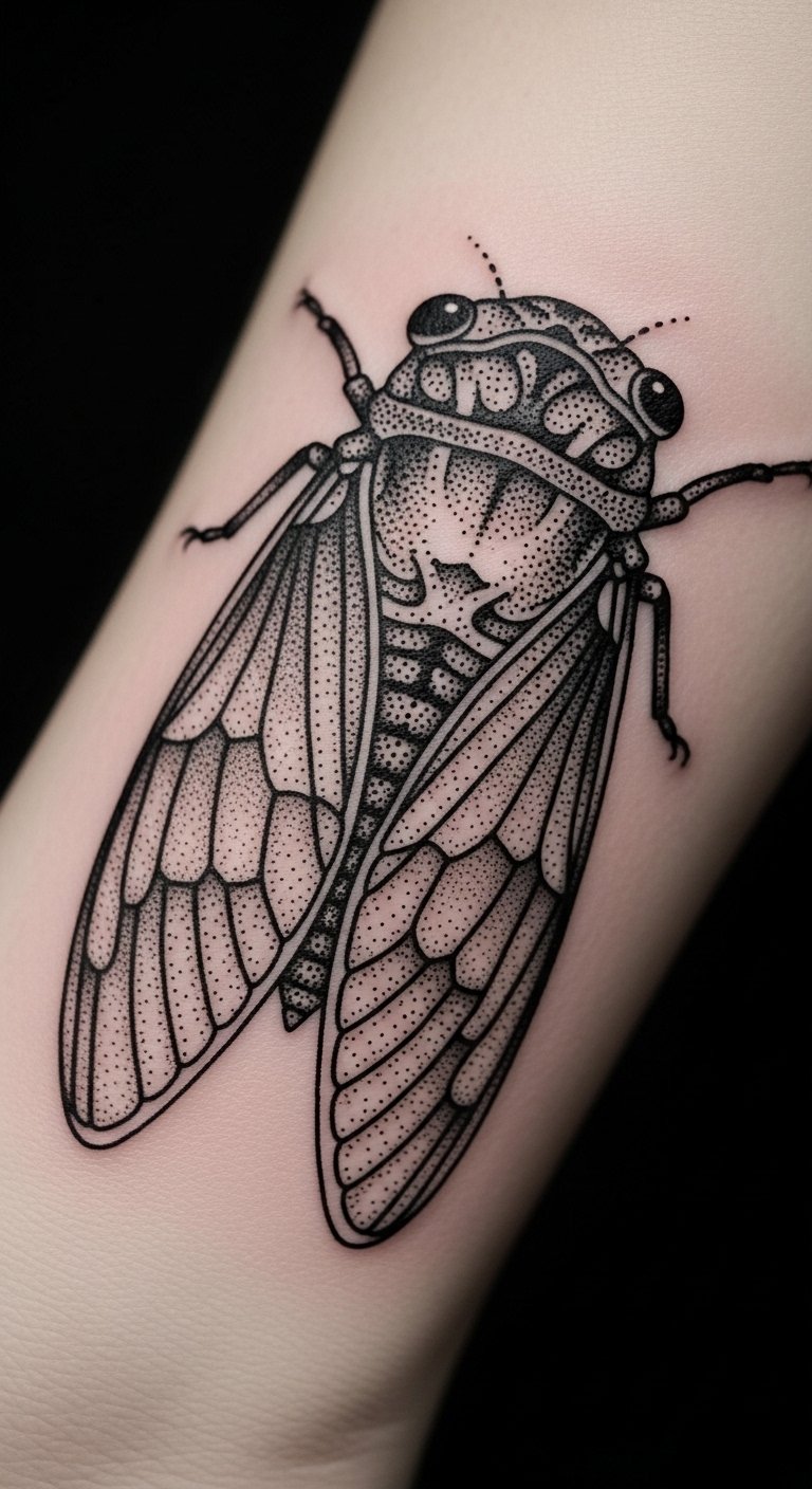 Use dots for texture. Dotwork cicada creates depth. It represents steady progress.