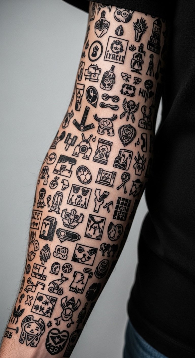 Sticker sleeve collections build with small, mixed tattoos. Express yourself step by step. Start with stick-ons from stores. Add pieces over time to budget. Mix themes like animals. Plan on paper first. This style grows with you.