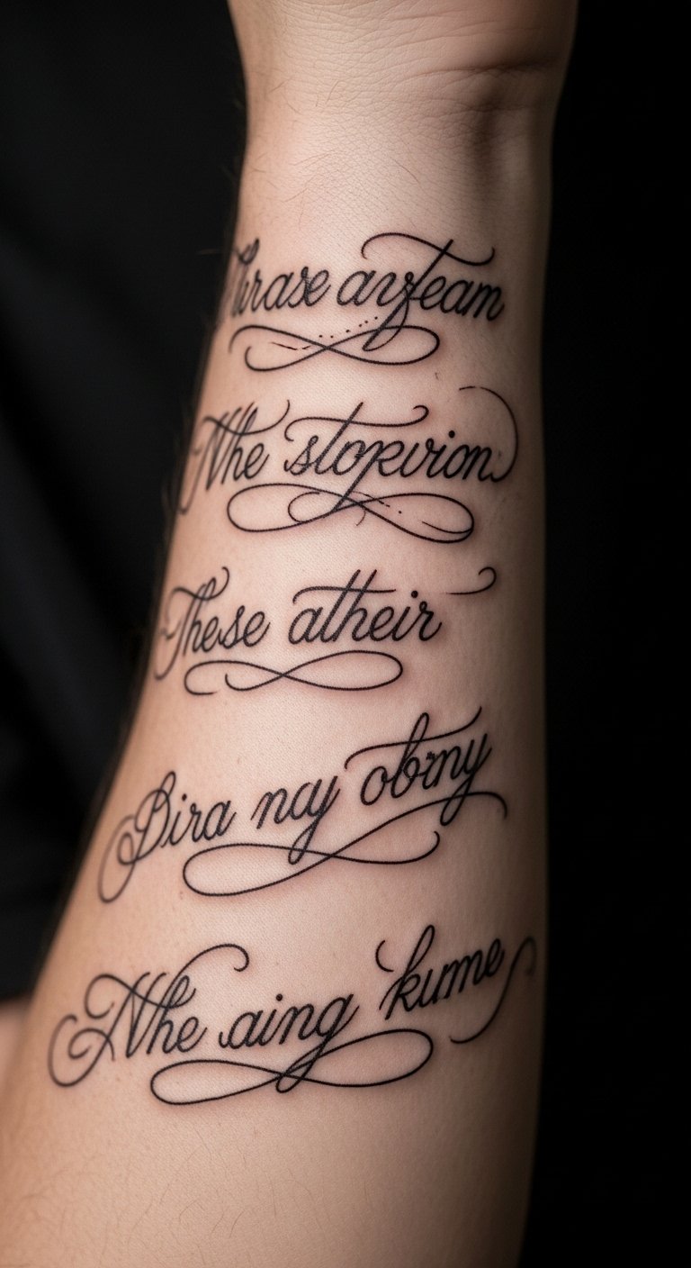 Meaningful script tattoos feature words that matter. Direct and emotional. Write phrases down. Find font experts cheaply. Go for short lines. Include dates. Practice handwriting. Speaks volumes simply.