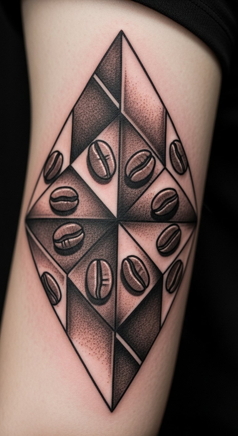 Geometric patterns turn coffee into shapes. Think triangles around a bean. Draw grids on paper to plan. Fit them to your arm. Look for promo deals at tattoo spots. Small ones go for $50. Use graph paper for home designs. Apply temporary geometric stickers. They help visualize the fit. Keep it modern and clean.