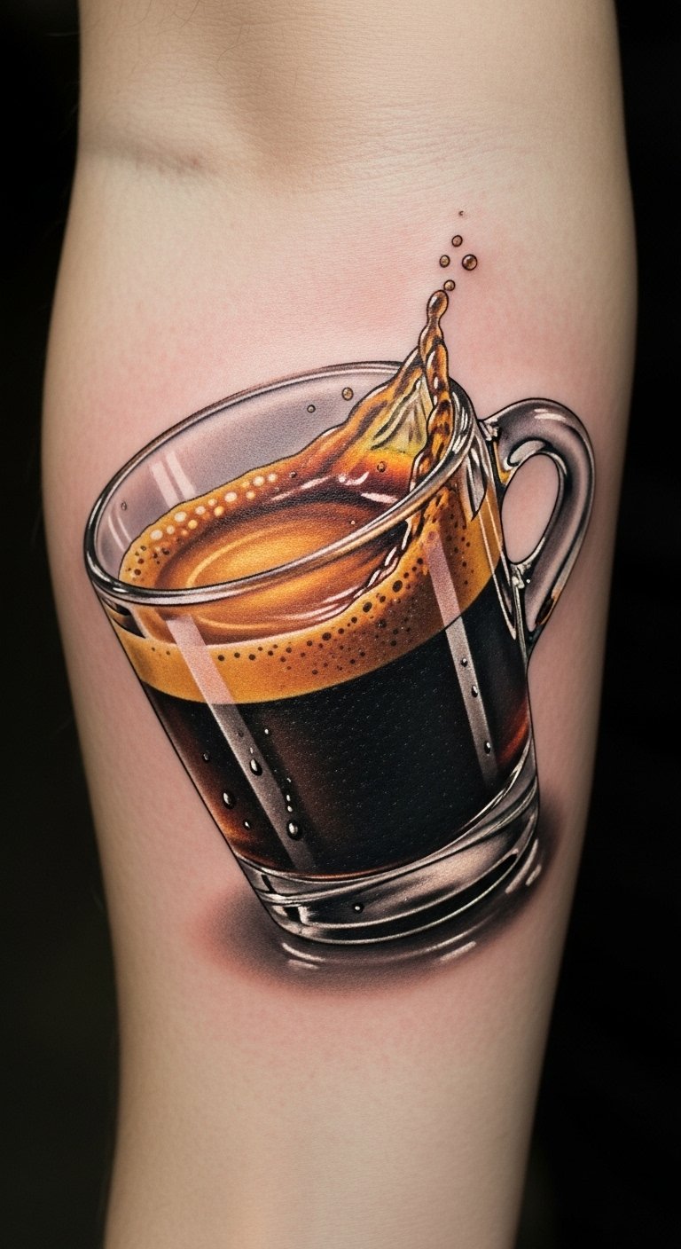Espresso shots in hyperreal style pop with detail. See the rich liquid. Practice shading on paper. Find an artist for details. Budget for $100 if it’s small. Use photo apps for home previews. Apply fake versions. This makes your arm stand out.