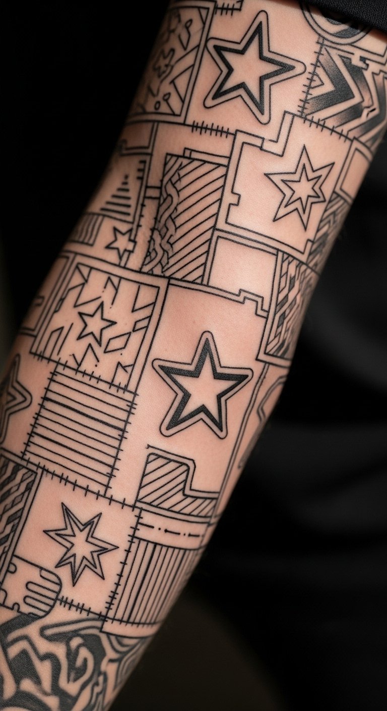 Sticker sleeve tattoos mix various elements for a personalized sleeve. Think of assorted symbols on your arm like a fun collage. They let you tell your story through art. Collect ideas by drawing on sticky notes at home—simple and quick. Attend local meetups where artists offer sleeve packages for $150. Use adhesive tattoos from craft stores to test combinations cheaply. Place them along your arm for a cohesive look. Sticky notes make planning accessible. This way, you build style step by step without high costs.