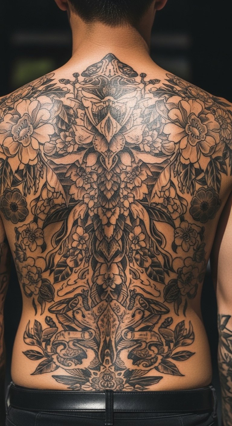 Blackwork tattoos deliver striking contrast with solid black ink. Envision geometric blocks on your back that stand out strong. These designs add edge to your appearance. Use graph paper from home to outline shapes—it’s straightforward and cost-free. Look for pop-up tattoo fairs where blackwork starts at $70. Try temporary stencils you can print at home for under $5. Position them on areas like your forearm for impact. Graph paper outlines help you visualize easily. This practical step ensures your tattoo fits your life without overspending.
