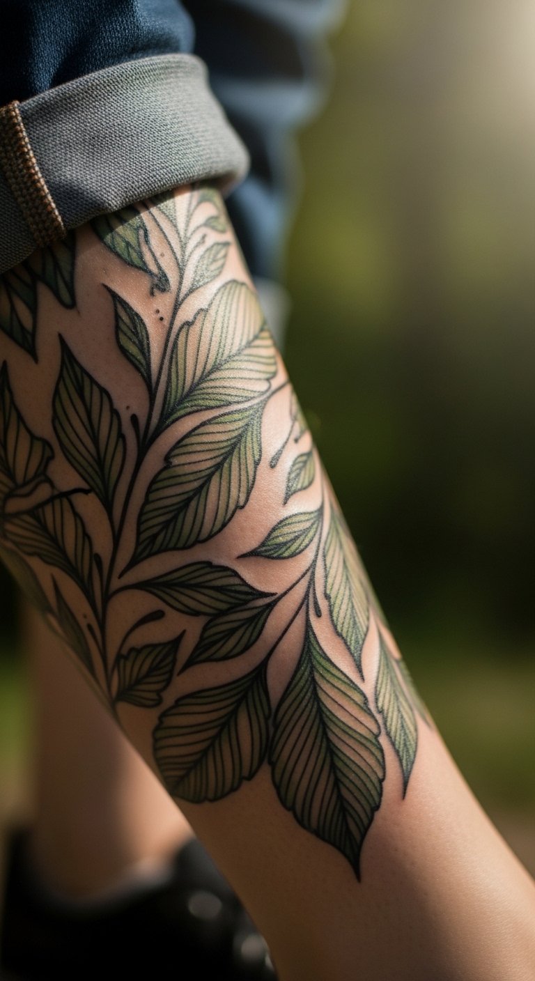 Eco-friendly tattoos highlight nature themes sustainably. Envision green leaves on your leg that promote awareness. They add purpose to your look. Use recycled paper to draw plans at home. Support local green studios starting at $90. Experiment with natural dyes for tests. Place on your calf for meaning. Recycled paper aids eco-friendly prep. This keeps your style thoughtful and low-cost.