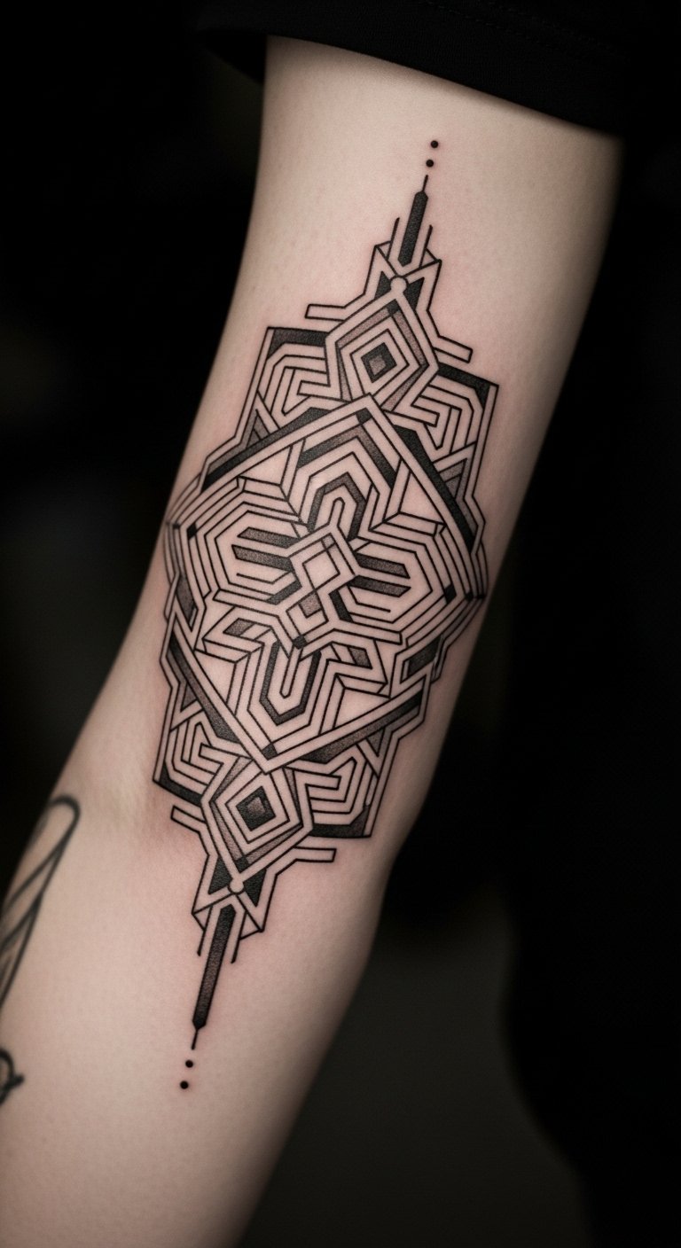 Abstract geometric tattoos play with shapes and lines. Envision triangles on your arm that intrigue. They give your style an artistic edge. Draw grids on paper for practice. Find group sessions for $75. Use string art kits for DIY mocks. Select your elbow for balance. Paper grids simplify design. This helps you express creativity on a budget.