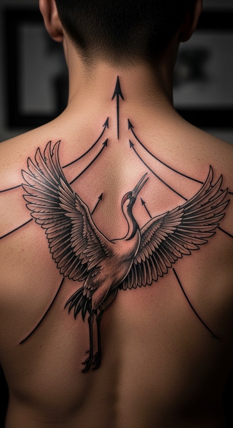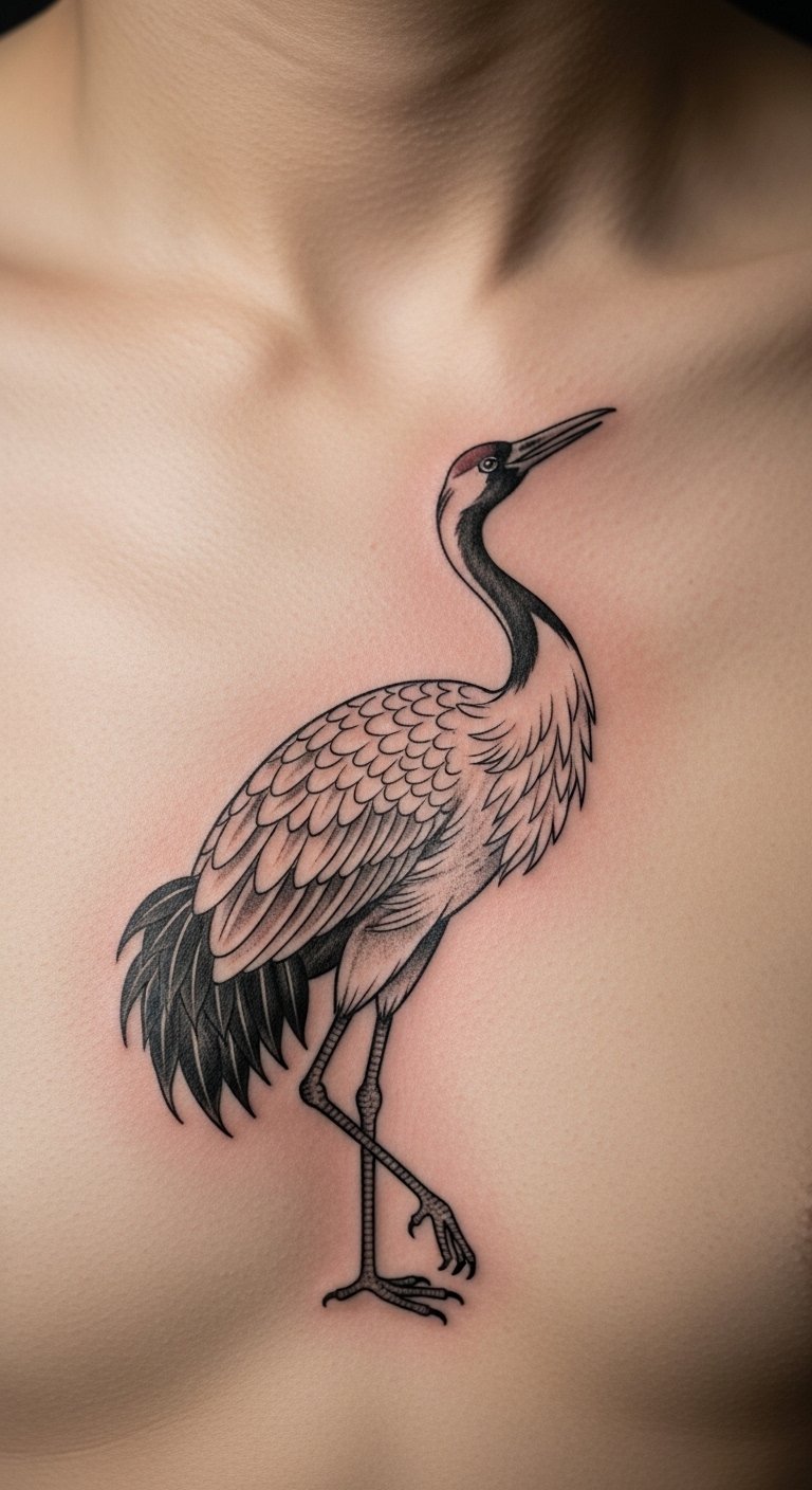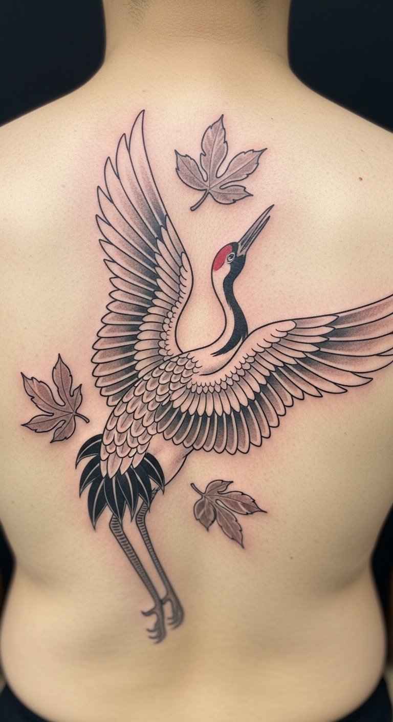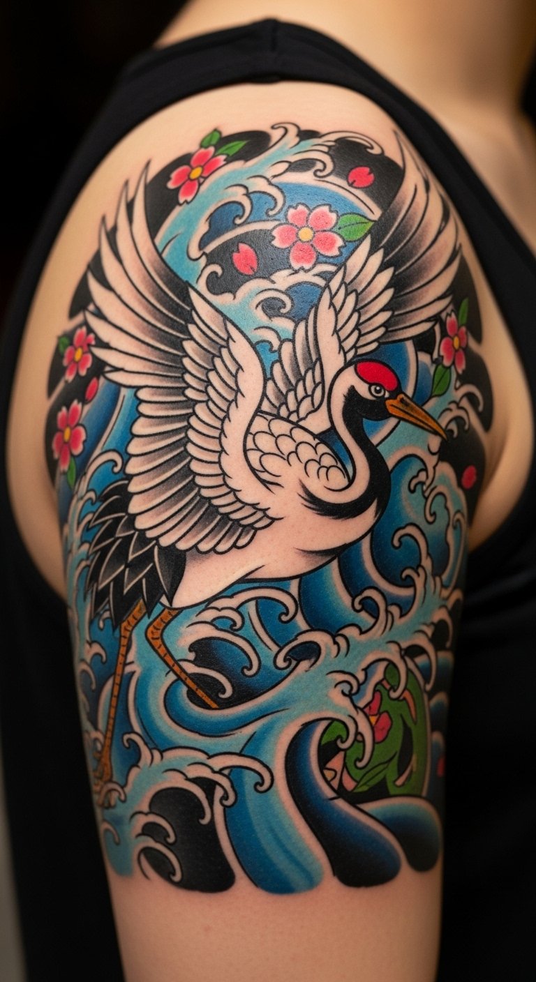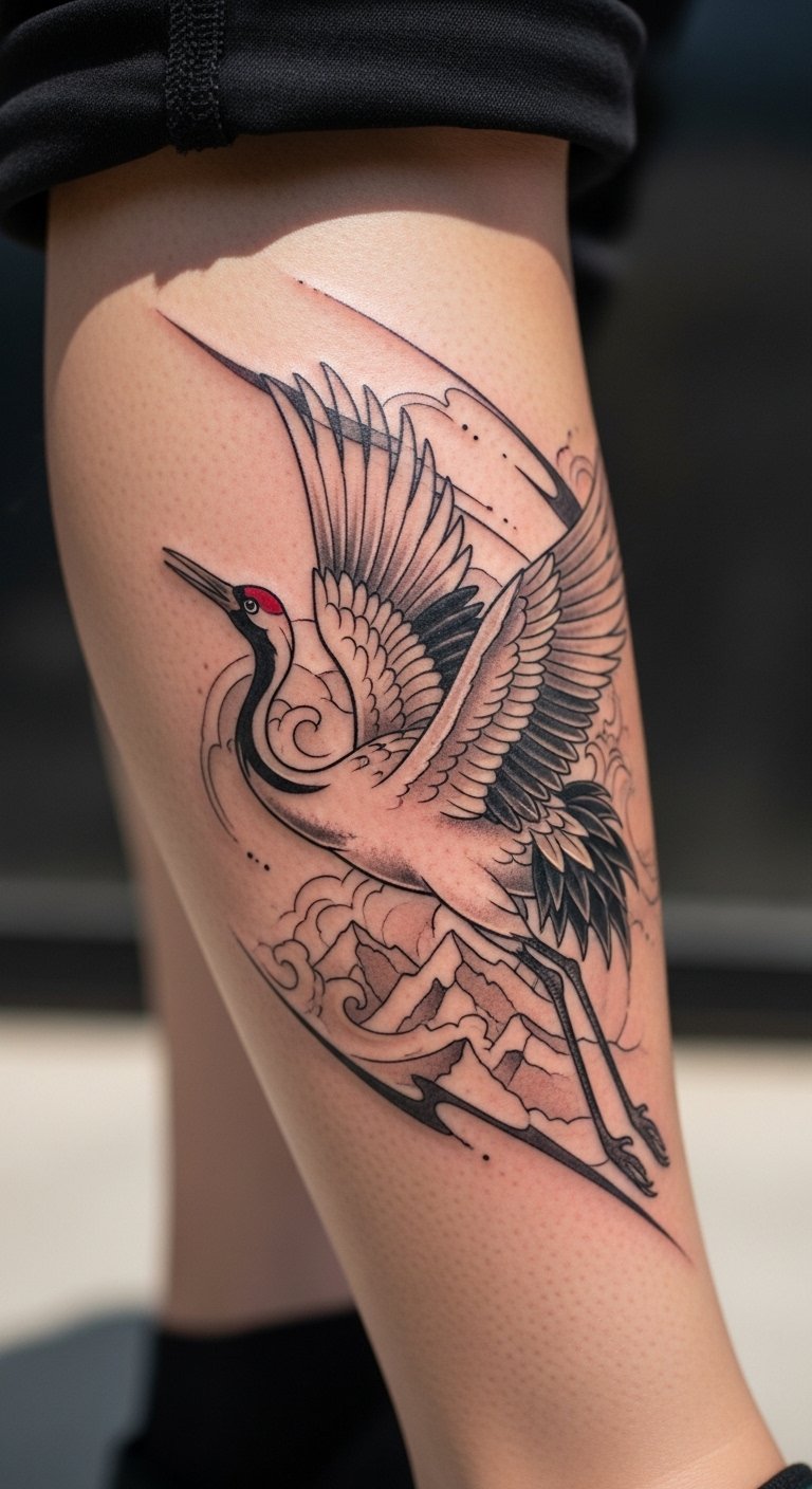 Picture a crane tattoo that echoes ancient Japanese art. This design uses bold lines and colors to show the bird mid-flight. Start with a simple sketch on paper. Use online templates for free ideas. Go to a local artist who specializes in traditional styles; many offer consultations for under $50. Add personal touches like favorite colors. Keep it budget-friendly by practicing with henna first. This lets you test the look without commitment. Real DIY tip: Draw the crane on your skin with washable markers to see how it flows. Focus on the bird’s wings for that soaring feel. Pair it with everyday items, like a keychain of a crane figure, to keep the spirit alive.