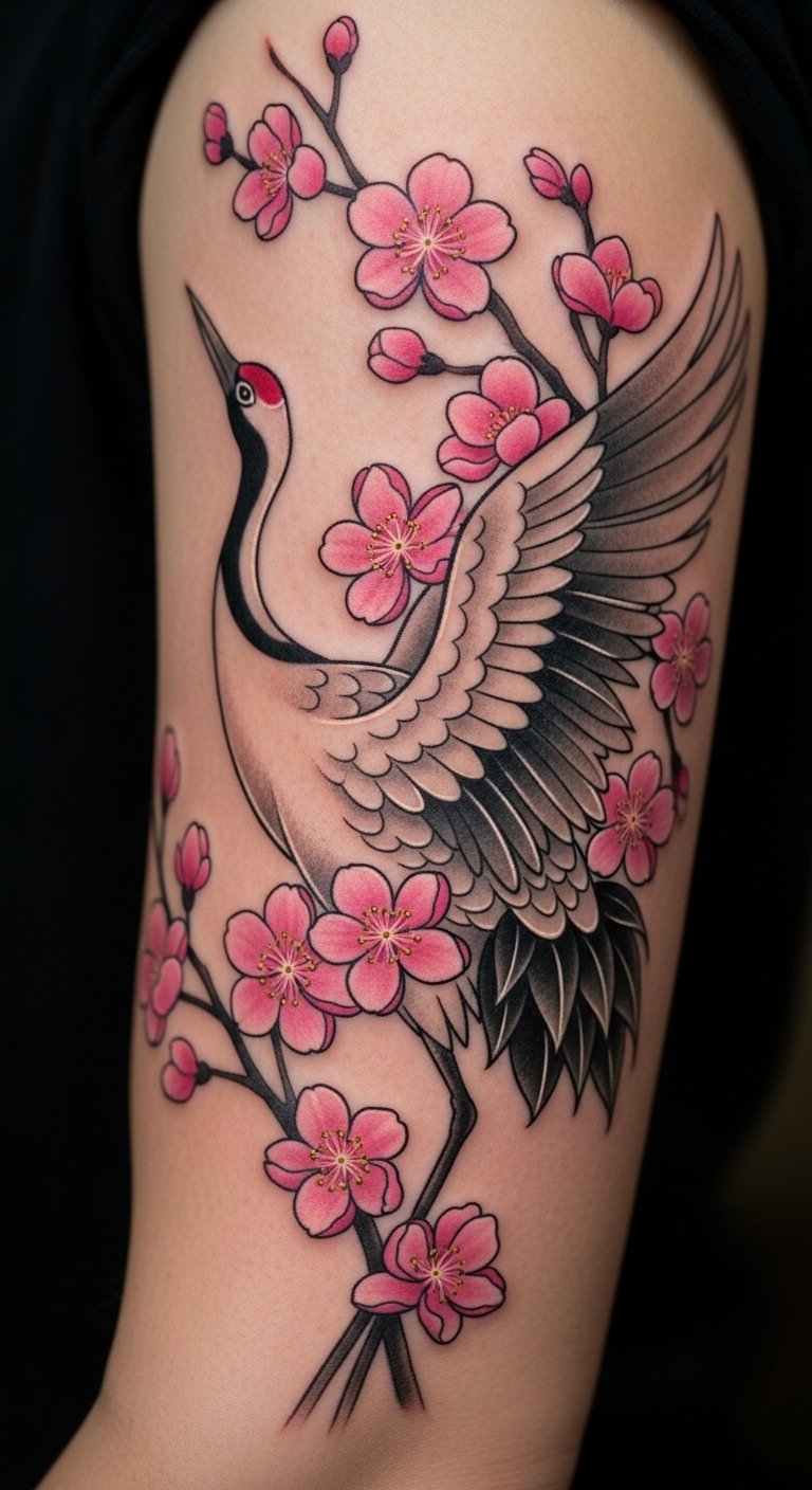 Combine a crane with cherry blossoms for a nod to life’s fleeting moments. The crane flies amid pink flowers, creating balance. Sketch this at home using free apps on your phone. Find blossom stencils online to trace. Visit a nearby shop for affordable ink sessions starting at $100. Mix in your birth flower for a twist. Try a temporary version from drugstores to experiment. Real DIY example: Use fabric markers on a shirt to mimic the design before going permanent. Place it on your wrist for easy viewing. This setup adds a layer of beauty to your day.