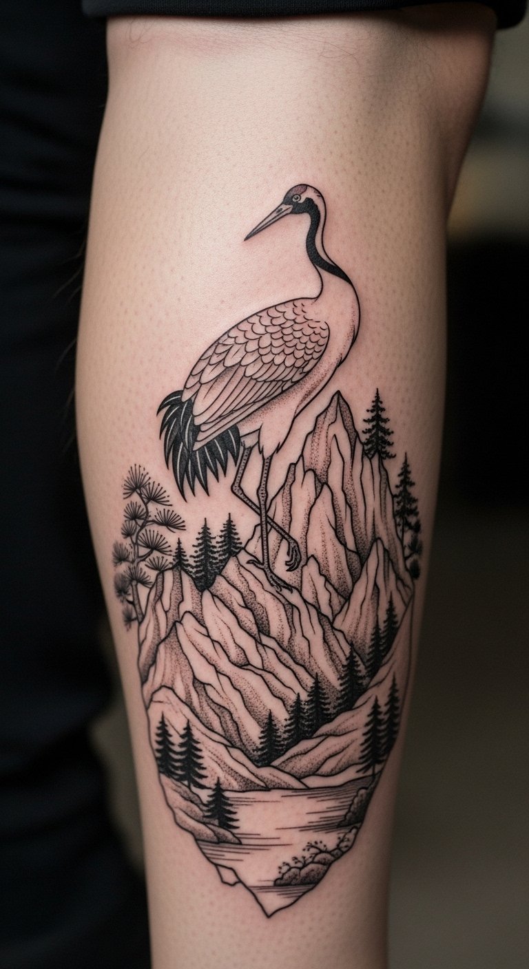Place a crane on mountains for endurance. The scene builds strength. Draw simple mountains at home. Find free landscape templates. A session might cost $95. Add personal peaks. Test with washable ink. Real DIY tip: Sketch it on hiking gear. Put it on your thigh for stability. This reflects your climbs.