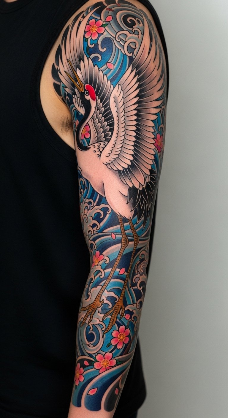 Build a crane into a sleeve for a big statement. Layer it with other motifs. Plan on paper first. Use free design tools. Artists handle sleeves for $150. Customize step by step. Practice with arm bands. Real DIY tip: Draw outlines on your arm daily. Cover your arm with meaning.
